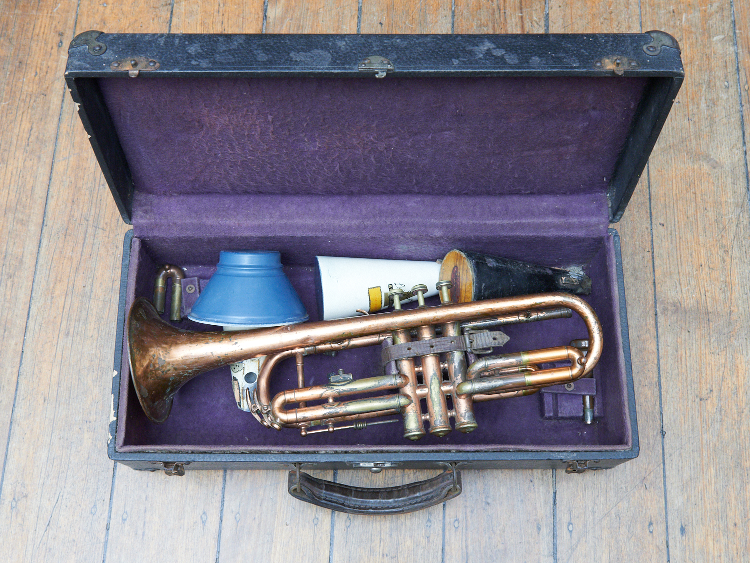 AN ANTIQUE 1920S ENGLISH BRASS TRUMPET WITH THREE CONES AND ORIGINAL MOUTHPIECE L.47CM (CASE), LEONARD JOEL DELIVERY SIZE: MEDIUM