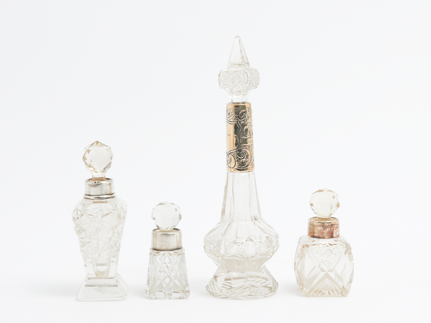 A COLLECTION OF FOUR HALLMARKED STERLING SILVER MOUNTED CUT CRYSTAL PERFUME BOTTLES H.20CM (TALLEST), LEONARD JOEL DELIVERY SIZE: MEDIUM