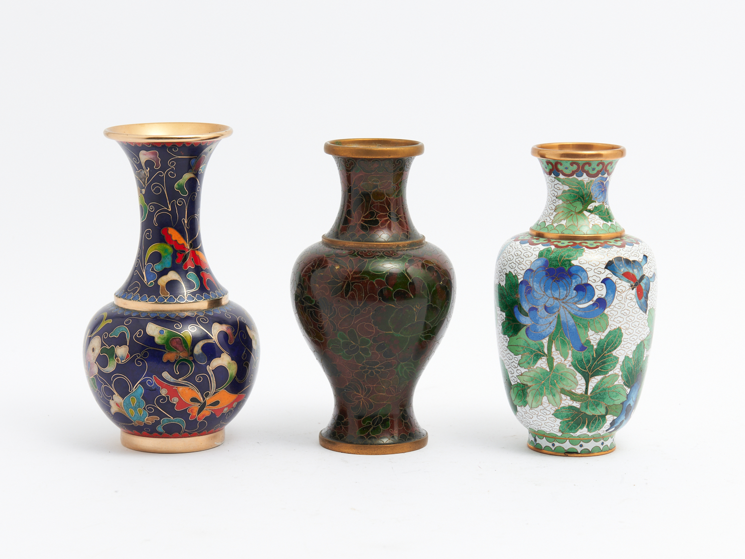 THREE CHINESE CLOISONNE VASES WITH BUTTERFLY AND FLORAL DECORATIONS H.19CM, LEONARD JOEL DELIVERY SIZE: MEDIUM