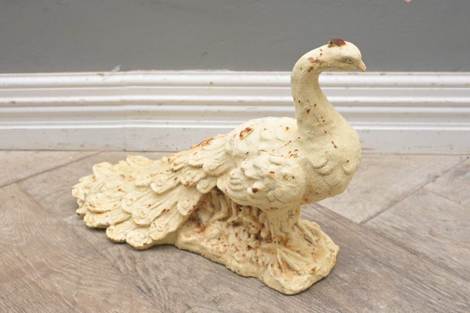 A CAST IRON GARDEN PEACOCK (A/F) (30H X 42W CM) (LEONARD JOEL DELIVERY SIZE: LARGE)