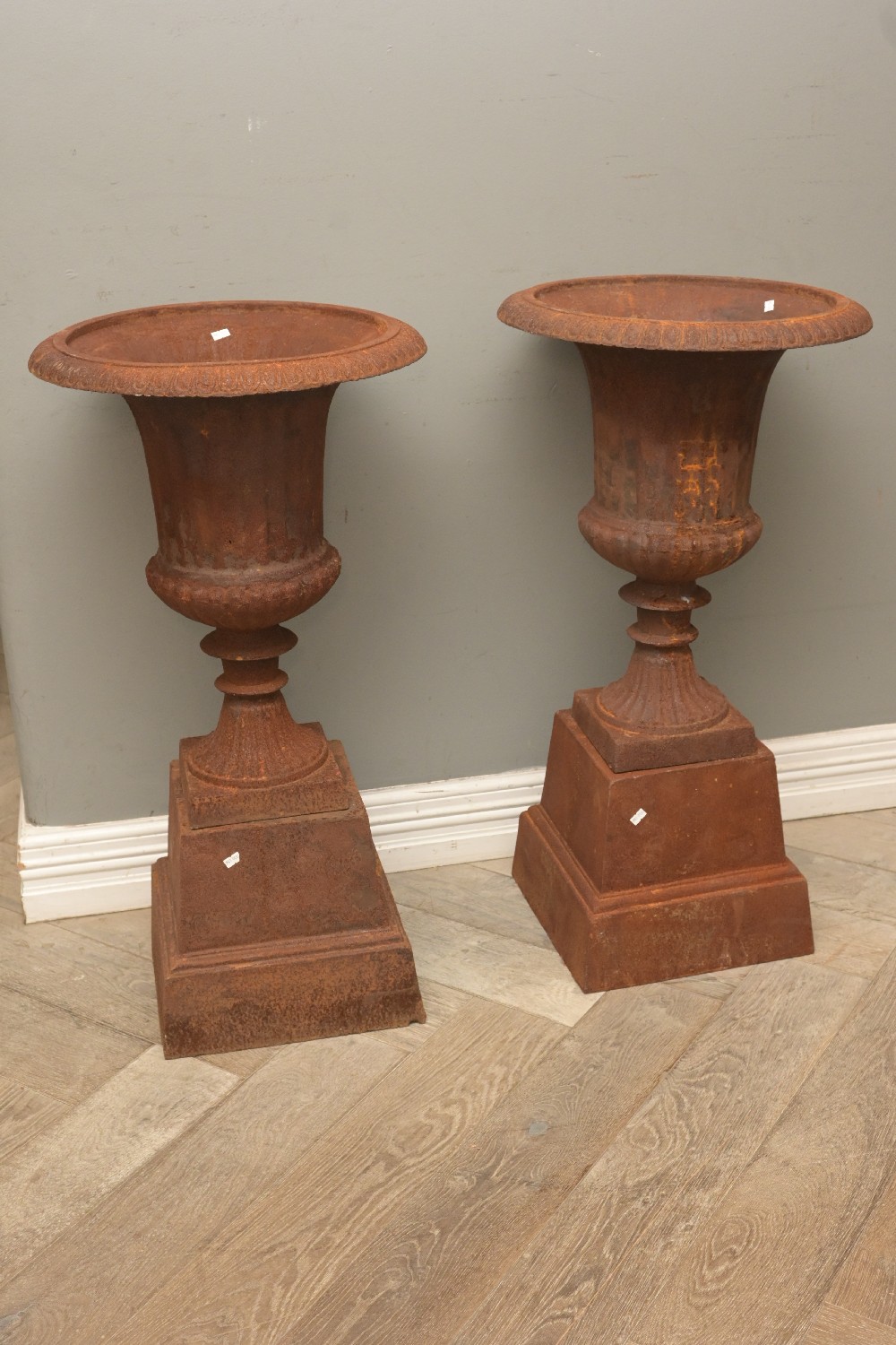 A PAIR OF CAST IRON URNS ON BASES (90H X 50DIA CM) (PLEASE NOTE THIS HEAVY ITEM MUST BE REMOVED BY CARRIERS AT THE CUSTOMER'S EXPENSE. LEONARD JOEL STAFF CANNOT ASSIST CARRYING THIS ITEM) (X-LARGE