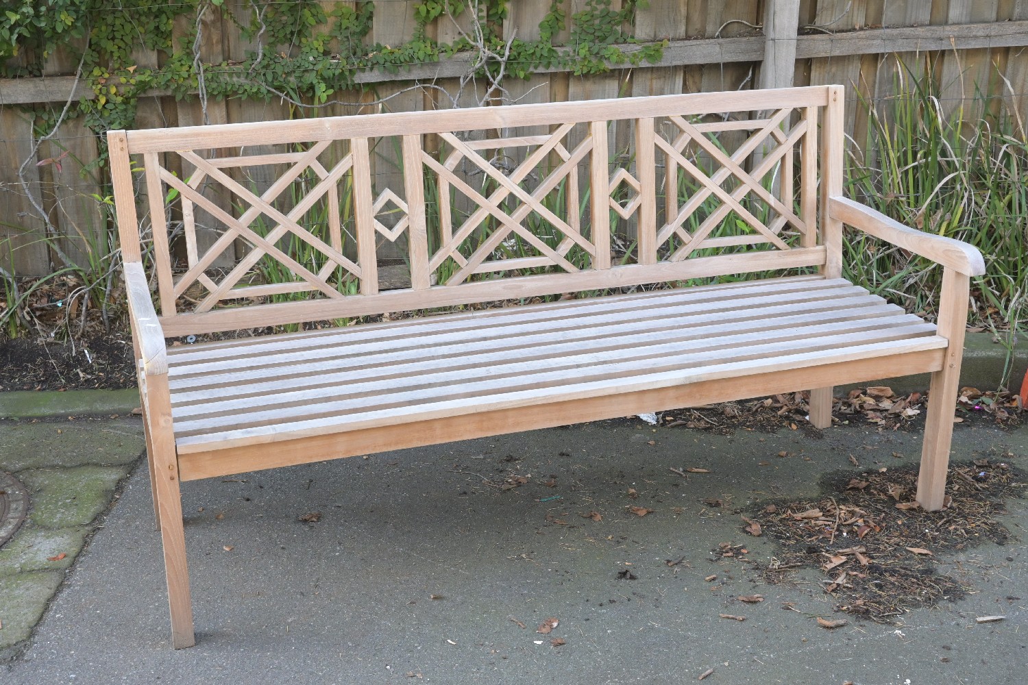 A TEAK GARDEN BENCH SEAT (93H X 179W X 63D CM) (PLEASE NOTE THIS HEAVY ITEM MUST BE REMOVED BY CARRIERS AT THE CUSTOMER'S EXPENSE. LEONARD JOEL STAFF CANNOT ASSIST CARRYING THIS ITEM) (LARGE ITEM)
