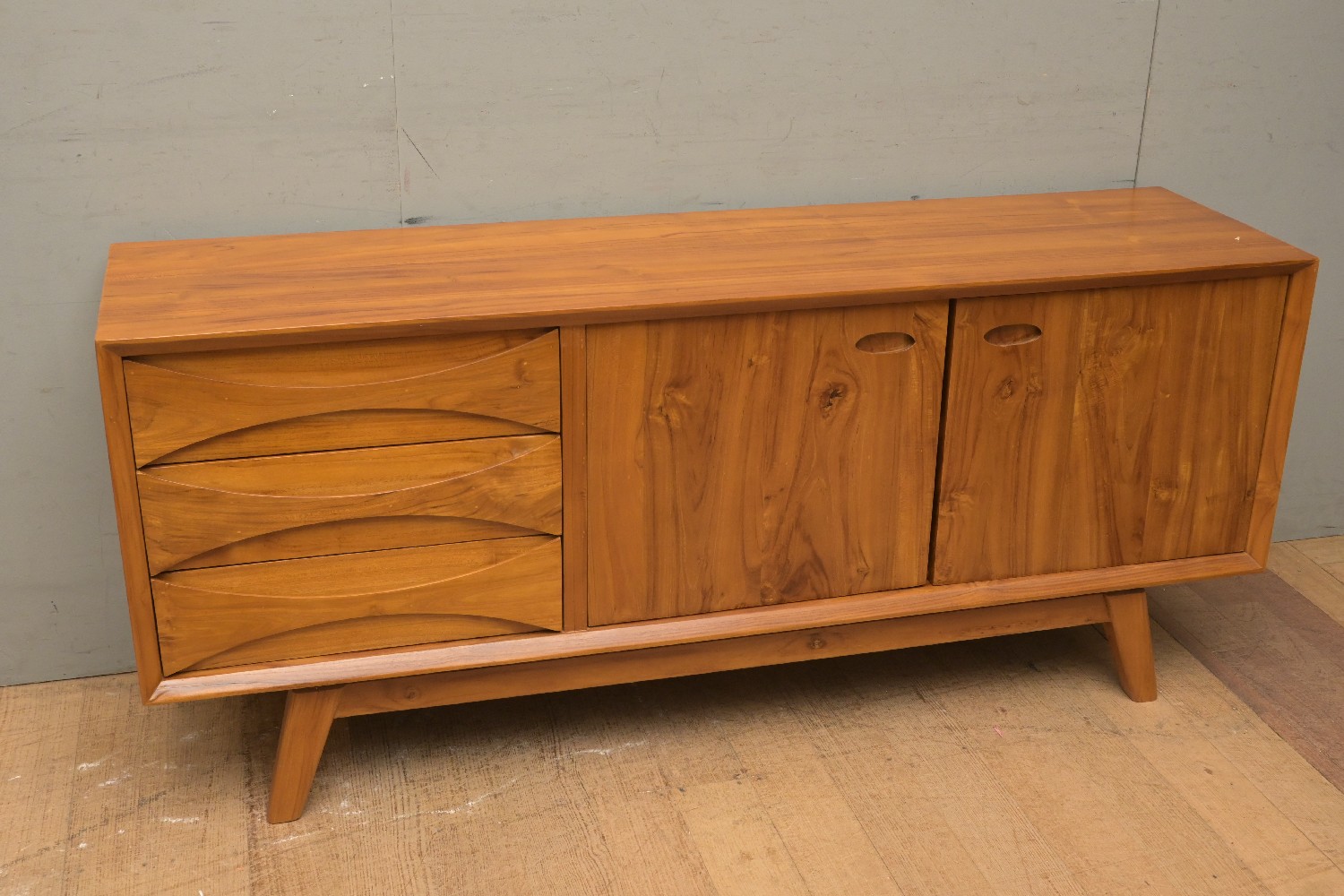 A RETRO STYLE TEAK SIDEBOARD (66H X 151W X 40D CM) (PLEASE NOTE THIS HEAVY ITEM MUST BE REMOVED BY CARRIERS AT THE CUSTOMER'S EXPENSE. LEONARD JOEL STAFF CANNOT ASSIST CARRYING THIS ITEM) (X-LARGE ITEM)