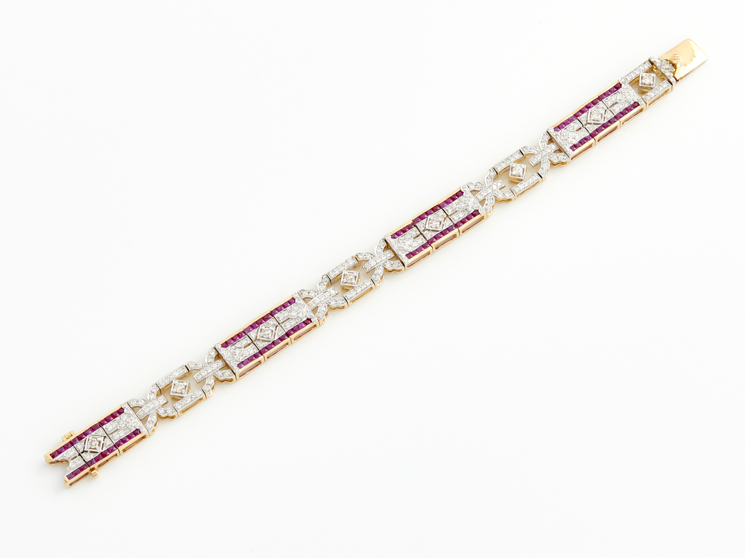 A DIAMOND AND RUBY BRACELET IN 14CT TWO-TONE GOLD, THE DIAMONDS TOTALLING 2.71CTS, THE RUBIES TOTALLING 3.11CTS, LENGTH 180MM, A/F