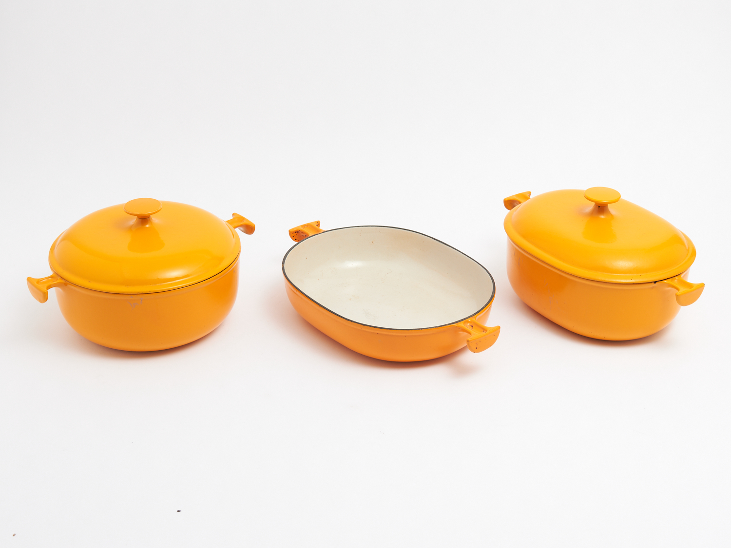 THREE LE CREUSET CAST IRON CASSEROLES IN YELLOW ENAMEL, TWO WITH LIDS L.36CM (LARGEST), LEONARD JOEL DELIVERY SIZE: LARGE