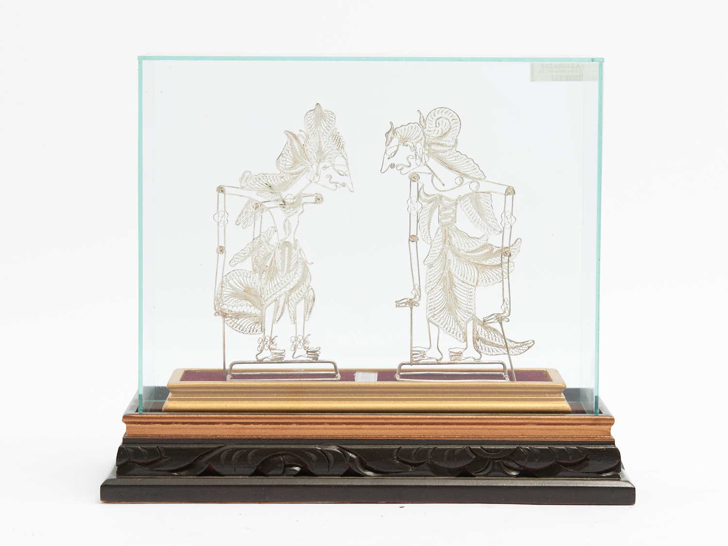 A PAIR OF SILVER 925 FILIGREE JAVANESE SHADOW PUPPETS IN DISPLAY CASE, H.20CM, LEONARD JOEL DELIVERY SIZE: SMALL