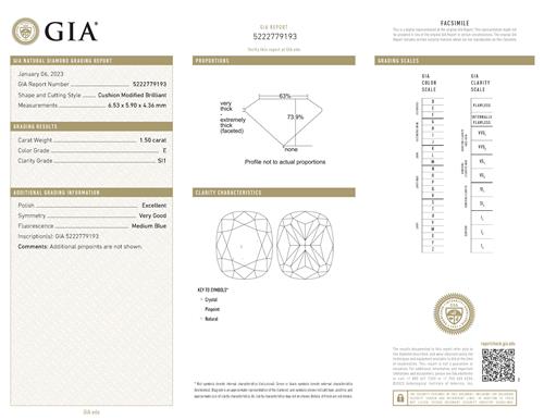 a GIA report numbered 5222779193, dated 6 January 2023, stating that the 1.50 carat diamond is natural, E colour, SI1 clarity, laser inscribed.