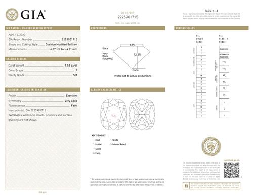 a GIA report numbered 2225901715, dated 14 April 2023, stating that the 1.51 carat diamond is natural, F colour, SI1 clarity, laser inscribed.