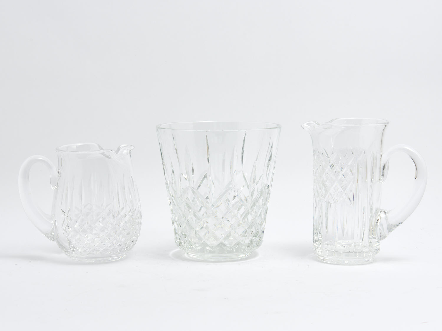 THREE PIECES OF WATERFORD CRYSTAL INCLUDING TWO JUGS AND A VASE H.19.5CM (TALLEST), LEONARD JOEL DELIVERY SIZE: MEDIUM