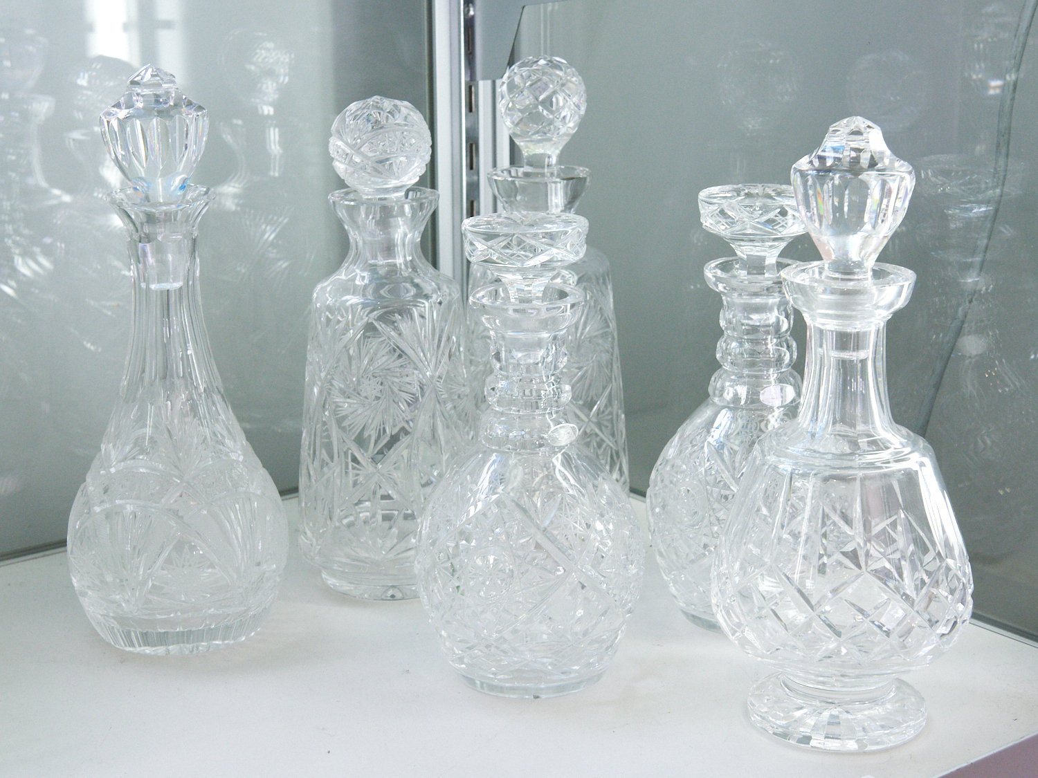 SIX CUT CRYSTAL DECANTERS INCLUDING ONE WATERFORD H.22CM (TALLEST) (CHIPS TO SOME OF THE STOPPERS), LEONARD JOEL DELIVERY SIZE: LARGE