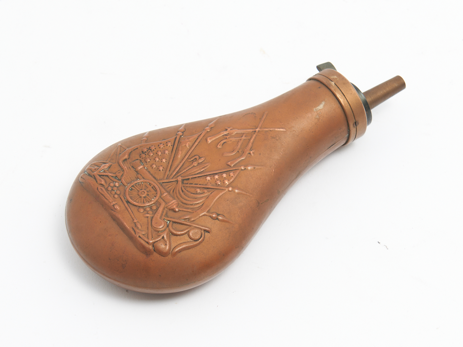 A 19TH CENTURY COPPER EMBOSSED POWDER FLASK L.18.5CM, LEONARD JOEL DELIVERY SIZE: SMALL