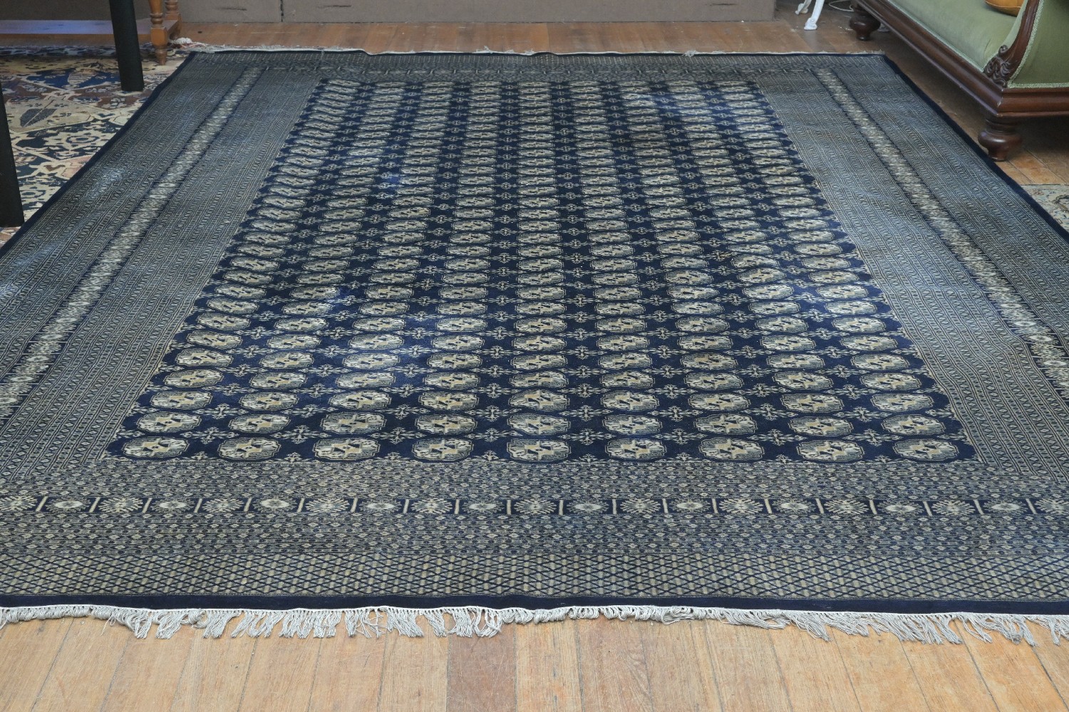 A LARGE BLUE PERSIAN INFLUENCED RUG WITH ELEPHANT PRINT DESIGN (A/F) (407 X 310 CM) (PLEASE NOTE THIS HEAVY ITEM MUST BE REMOVED BY CARRIERS AT THE CUSTOMER'S EXPENSE. LEONARD JOEL STAFF CANNOT ASSIST CARRYING THIS ITEM) (X-LARGE ITEM)