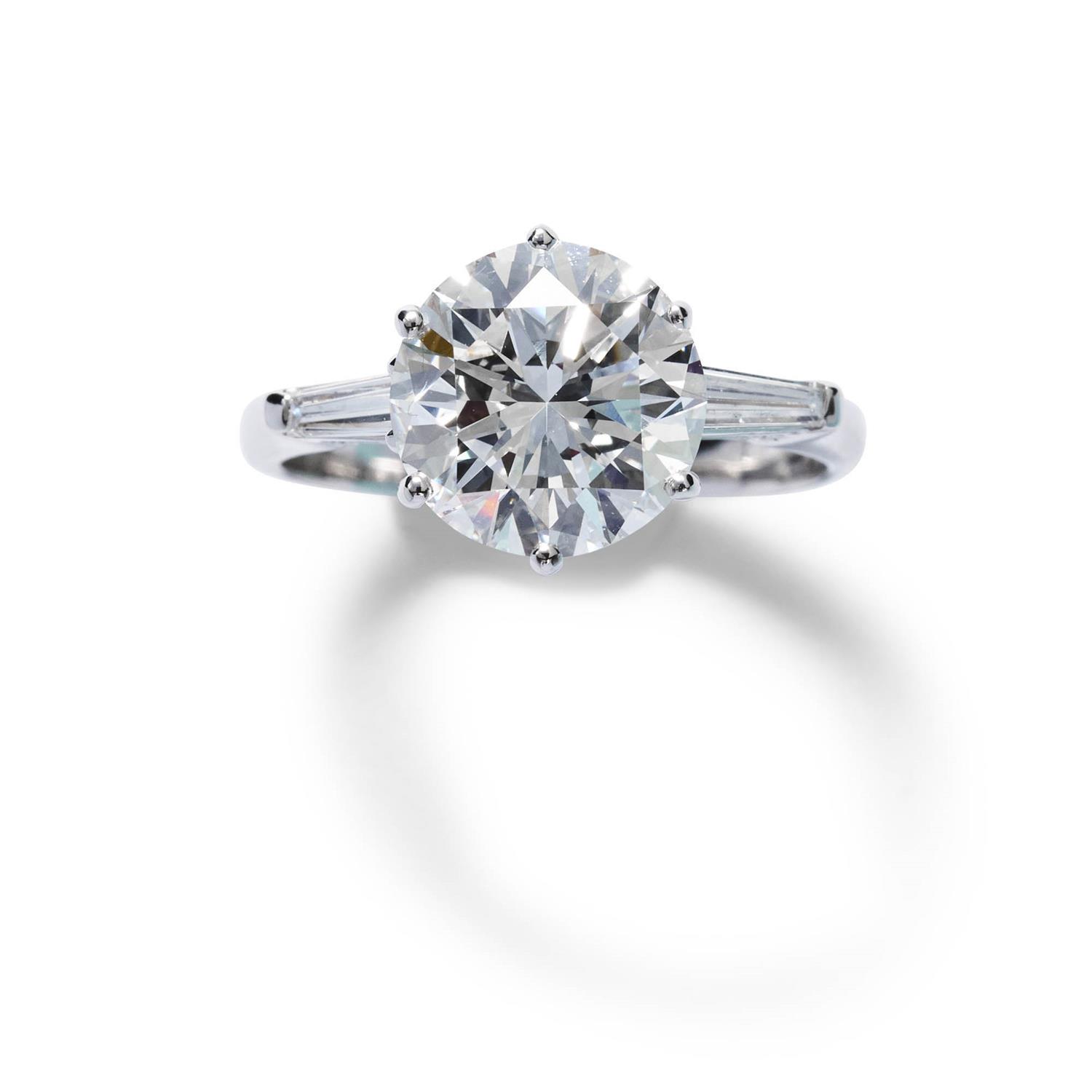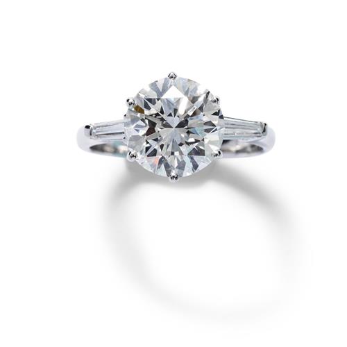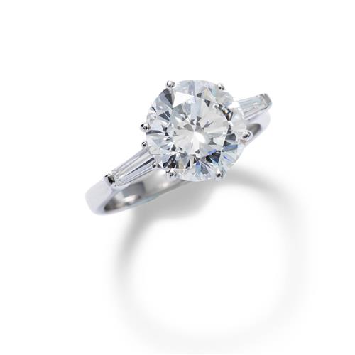 The round brilliant-cut diamond weighing 3.08 carats, is claw-set between a pair of tapered baguette diamonds, mounted in 18ct white gold, size L.