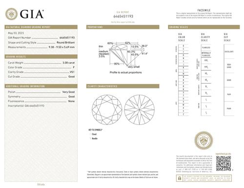 Accompanied by a facsimile GIA report numbered 6465451193, dated 3 May 2023 stating that the 3.08 carat diamond is natural, F colour, VS1 clarity, laser inscribed.