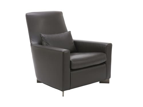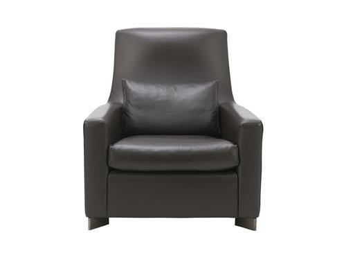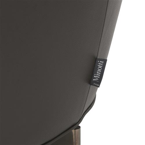 Dark brown leather upholstery. Minotti tag and branding to underside of cushion.