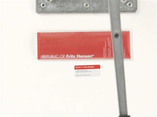 White fenix top with satin finished aluminium banding and a four point satin finished aluminium base with plastic feet caps. Stamped and stickered to underside.