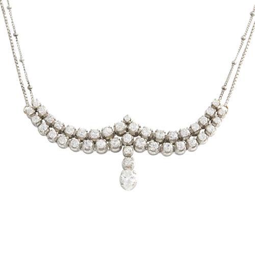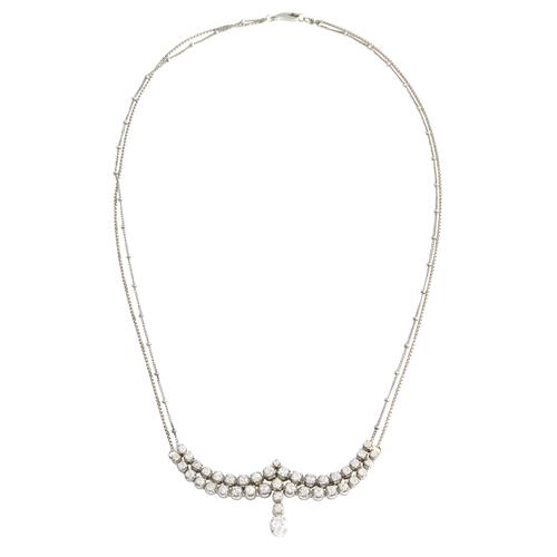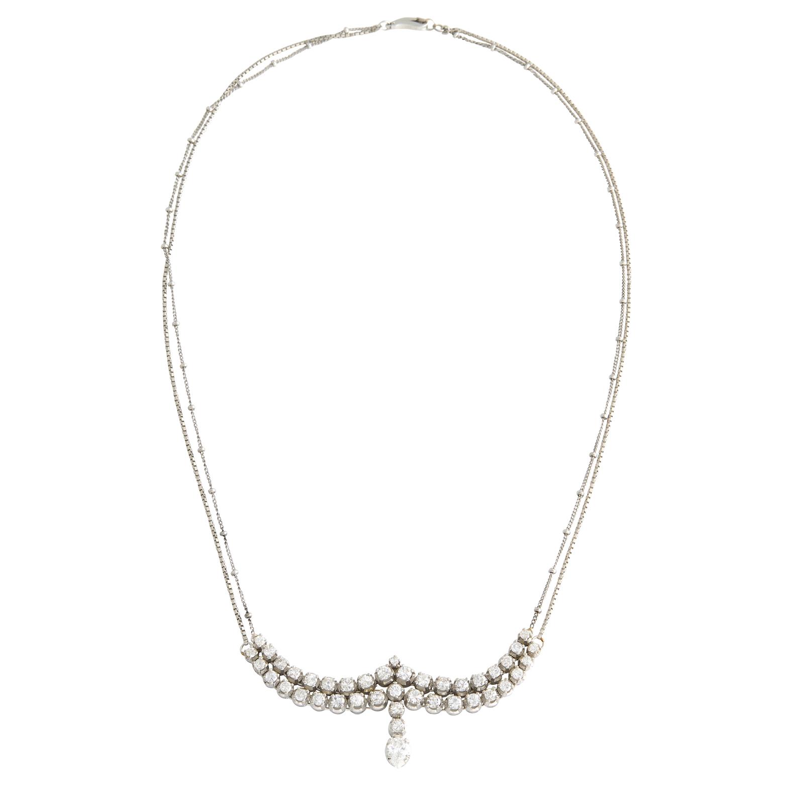 Terminating on a pear-shaped diamond swing drop supported from a scroll motif claw-set with brilliant-cut diamonds completed by a twin chain necklace, the diamonds together weighing approximately 3.00 carats, length 440mm, gross weight approximately 17.4 grams.