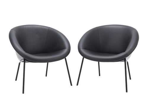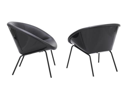 Black perforated leather seating with black plastic wrap around shells. Glossy black powder coated metal leg frames with black plastic feet. Stickered and stamped.