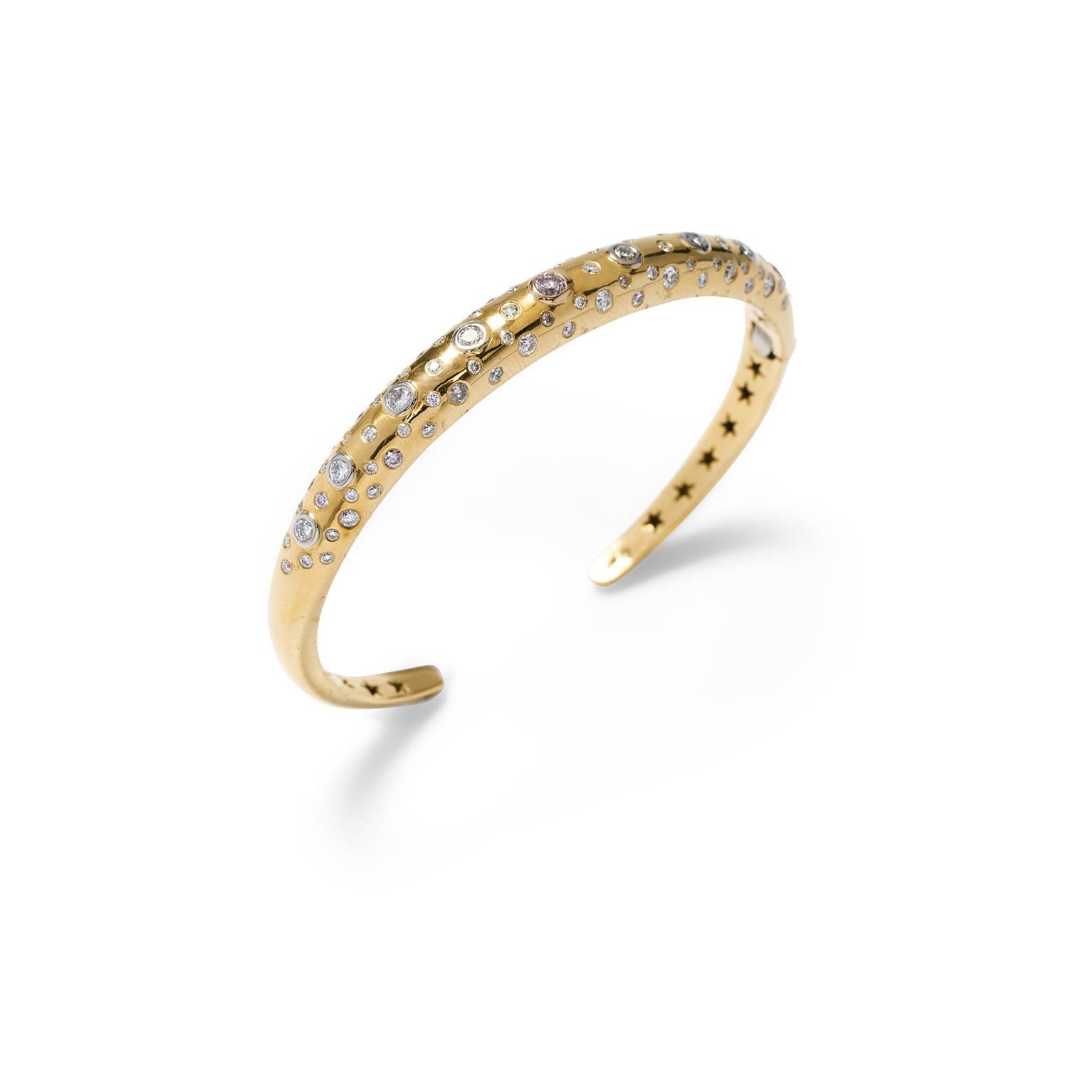 Designed as a tapered cuff hinged to one end, the top collet-set with a brilliant-cut diamond of pink tint flanked at intervals with near colourless brilliant-cut diamonds, the reverse pierced out in a star pattern, the diamonds together weighing approximately 3.66 carats, gross weight approximately 24 grams, width 7mm, length 4mm, circumference 173mm, maker's mark S.