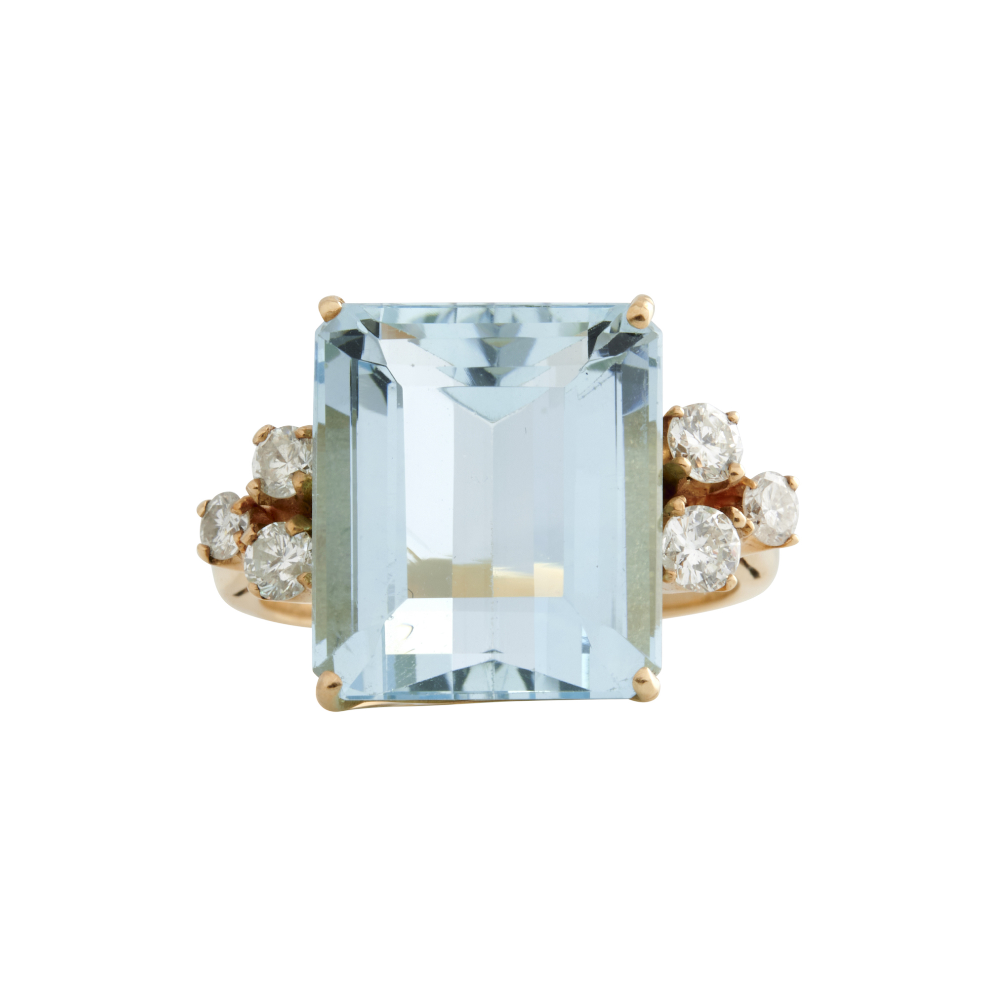 Centring a claw-set emerald-cut aquamarine weighing approximately 8.50 carats, flanked by trefoils of claw-set brilliant-cut diamonds together weighing approximately 0.30 carats, size O.