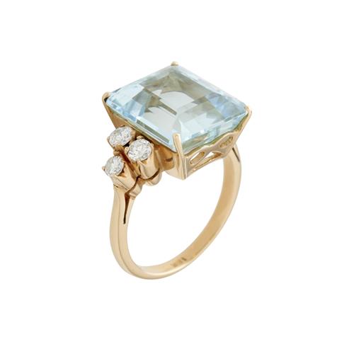 Condition: aquamarine is light to medium blue with medium saturation, eye clean, fine, light scratches. The diamonds are bright and lively, probably of I / J colour and SI - P1 clarity, as gauged and graded within the limitations of the cutting style and the mounting. The mounting displays scratches, commensurate with age and wear. Can be polished easily.