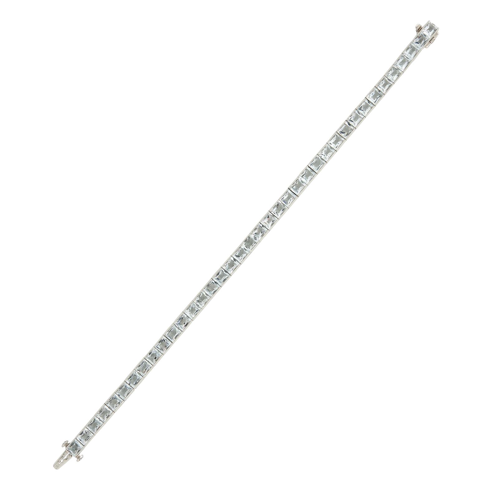 Modelled as a continuous line of forty-four French-cut aquamarines together weighing approximately 10.86 carats, completed by a tongue and groove clasp, length 180mm, gross weight 18.3 grams.