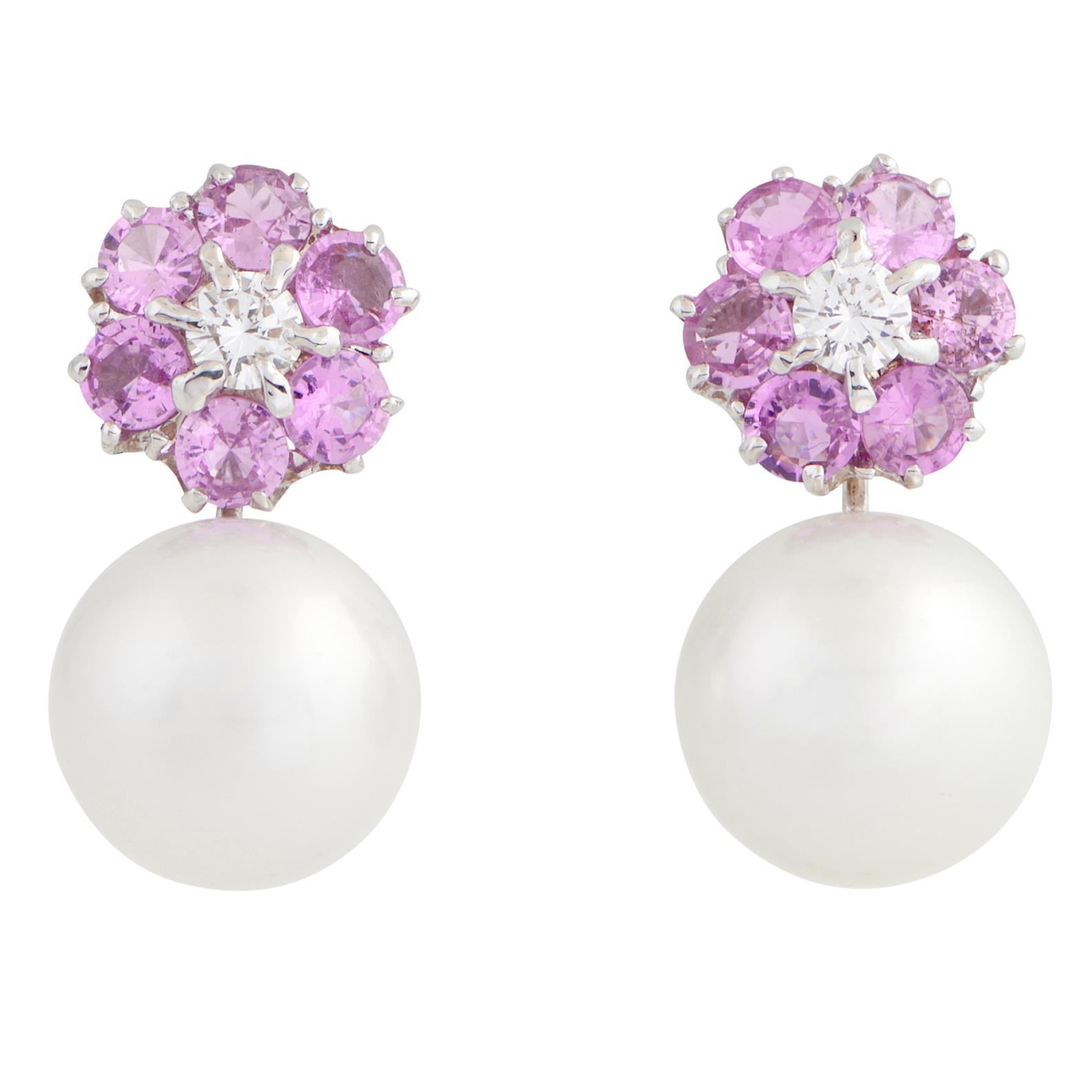 Each earring suspending a round pearl of white hues measuring approximately 13.00mm, below a brilliant-cut diamond and circular-cut pink sapphire cluster surmount, the diamonds together weighing approximately 0.56 carats, the sapphires together weighing approximately 3.80 carats, to post and butterfly fittings, length 26mm.