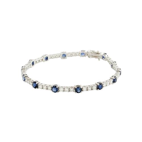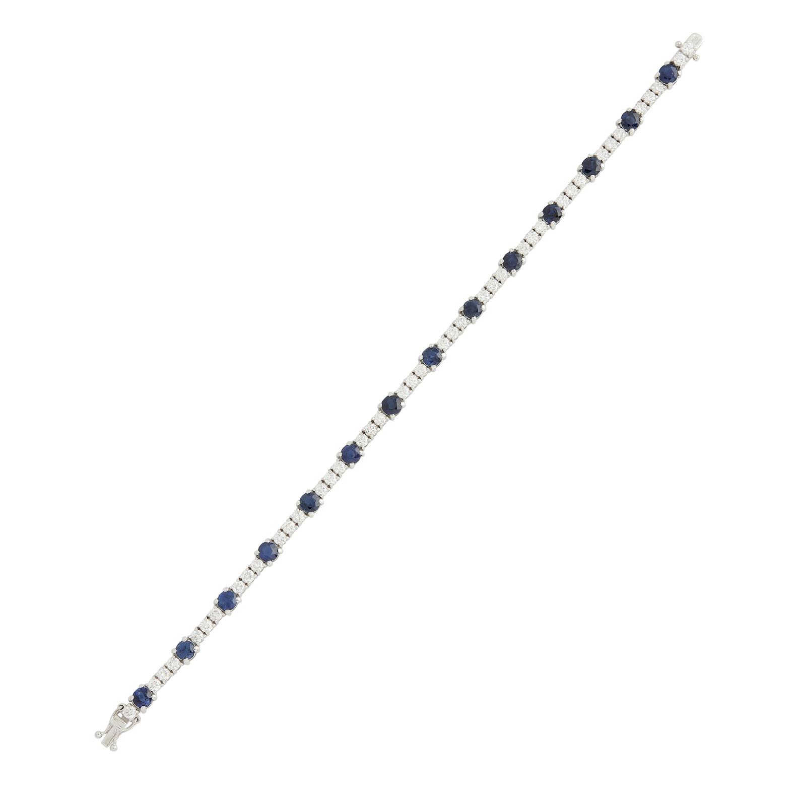 Modelled as a continuous line of claw-set brilliant-cut diamonds, spaced at intervals with claw-set circular-cut sapphires, the diamonds together weighing approximately 3.00 carats, the sapphires together weighing approximately 5.60 carats,