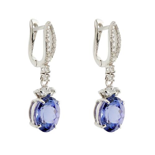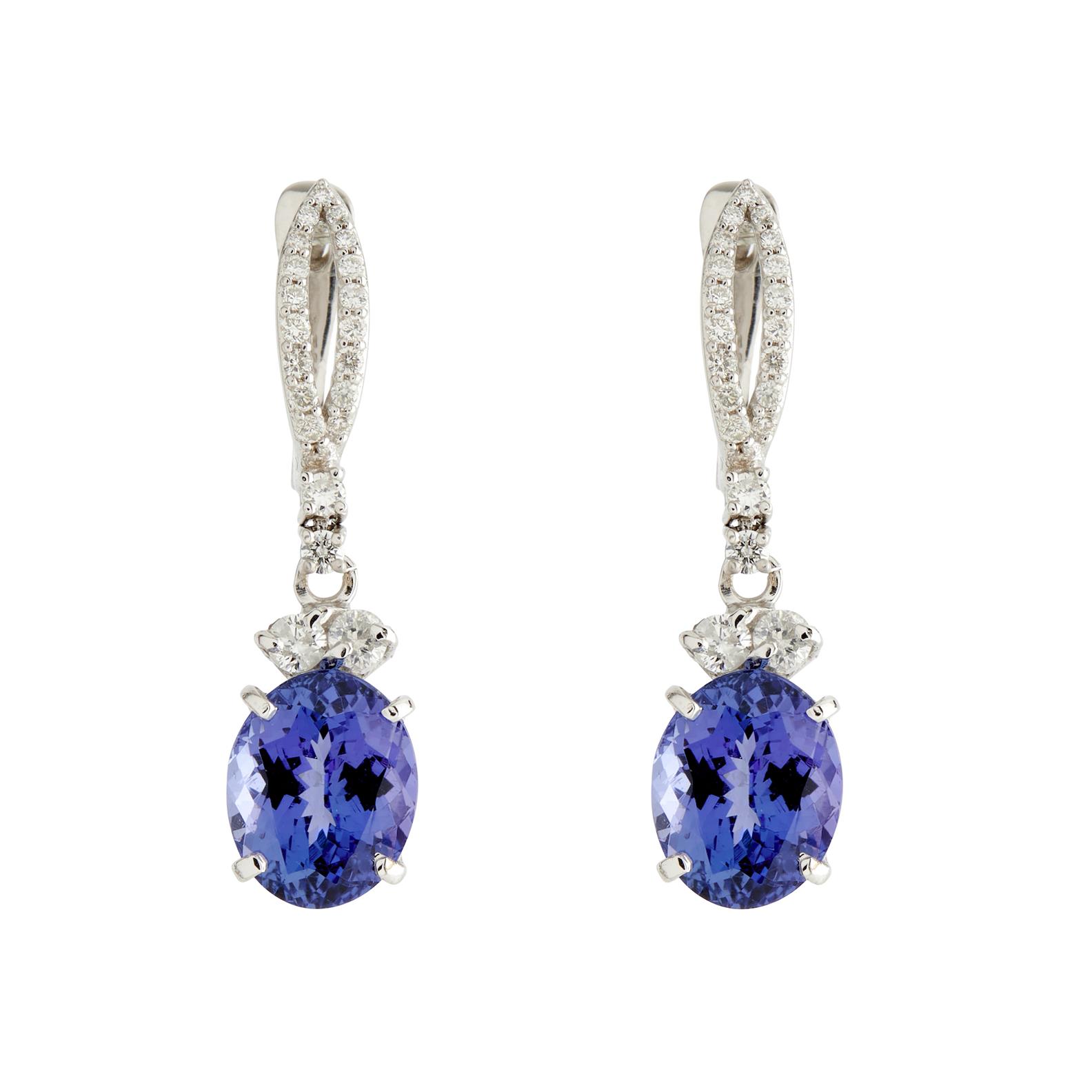 Each earring comprising a claw-set oval-cut tanzanite suspended below an open marquise shaped diamond surmount, the tanzanites together weighing approximately 6.82 carats, the diamonds together weighing approximately 0.55 carats, to European hook fittings, length 30mm.