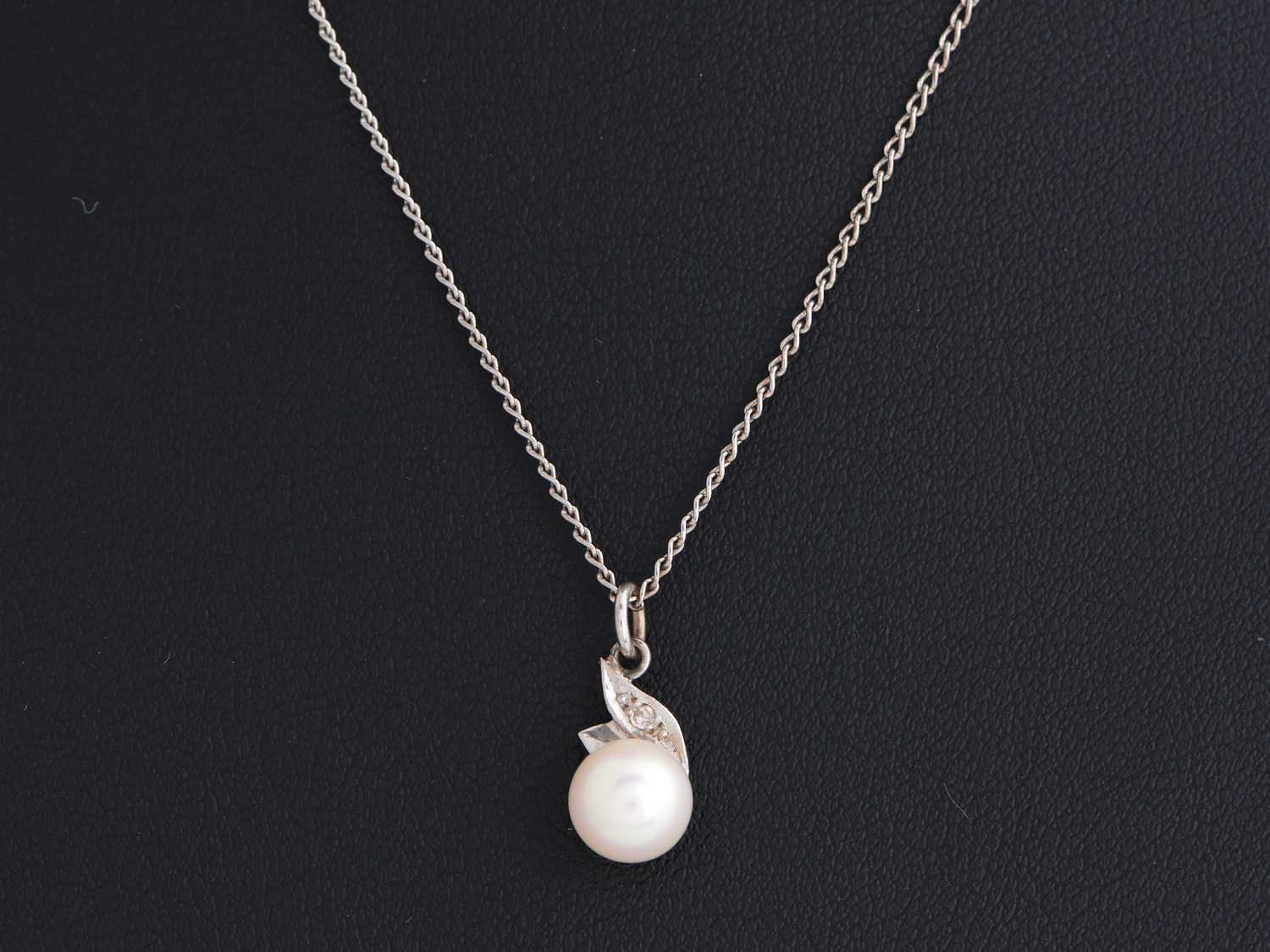 A PEARL AND DIAMOND PENDANT NECKLACE IN SILVER, 410MM, ACCOMPANIED BY A BOX