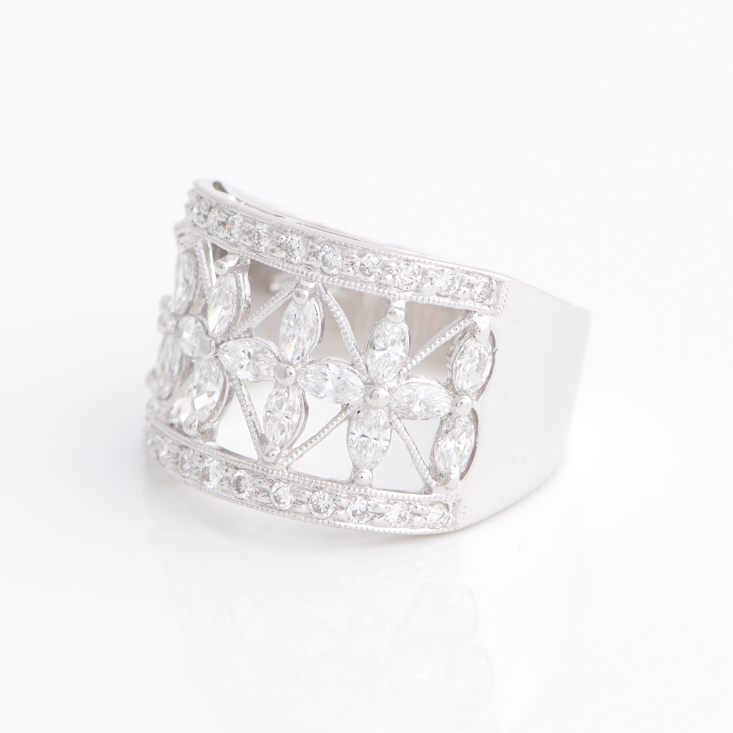 AN OPENWORK DIAMOND RING IN 18CT WHITE GOLD, SIZE L, 6.7GMS