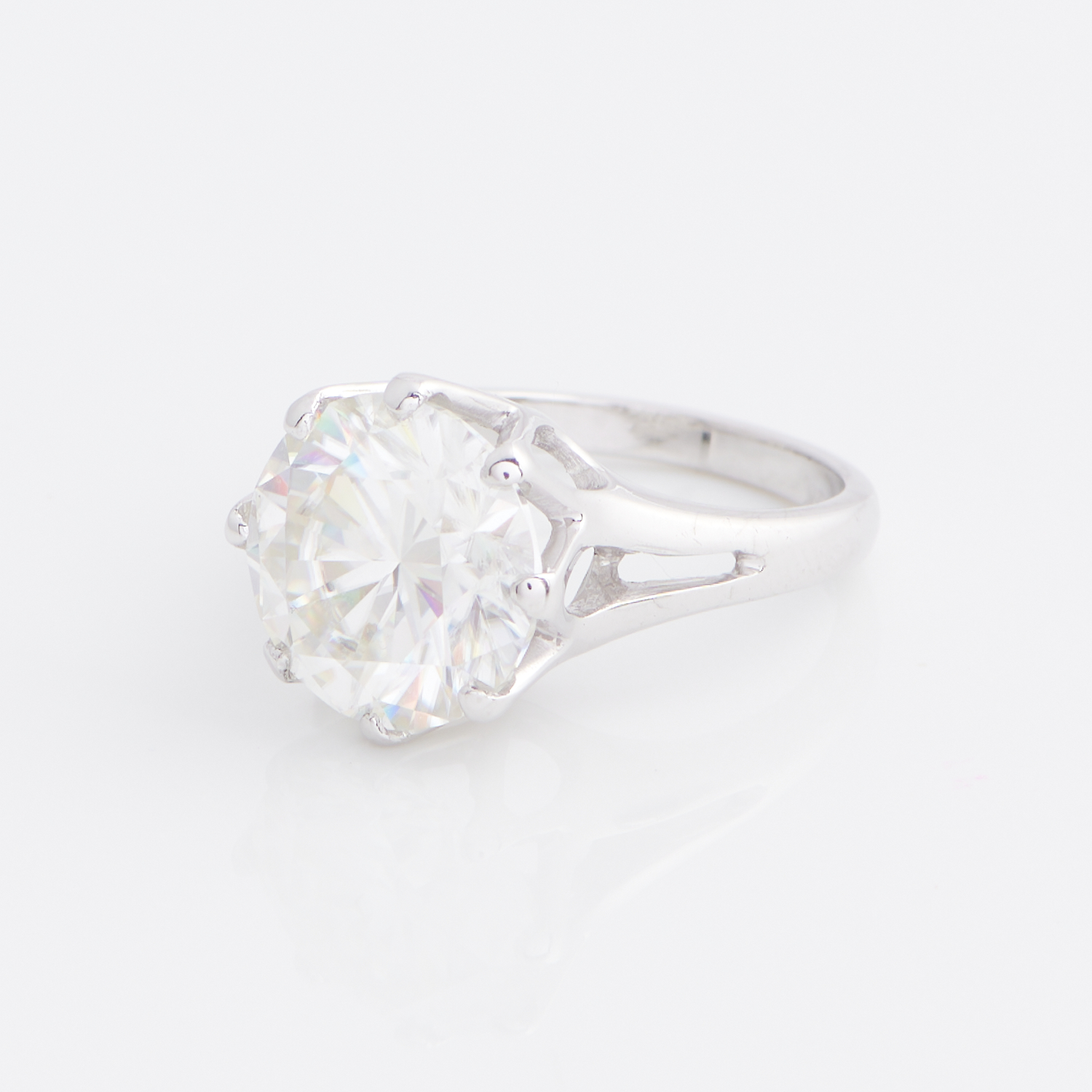 A MOISSANITE RING IN 18CT WHITE GOLD, THE MOISSANITE WEIGHING 6.15CTS, SIZE M