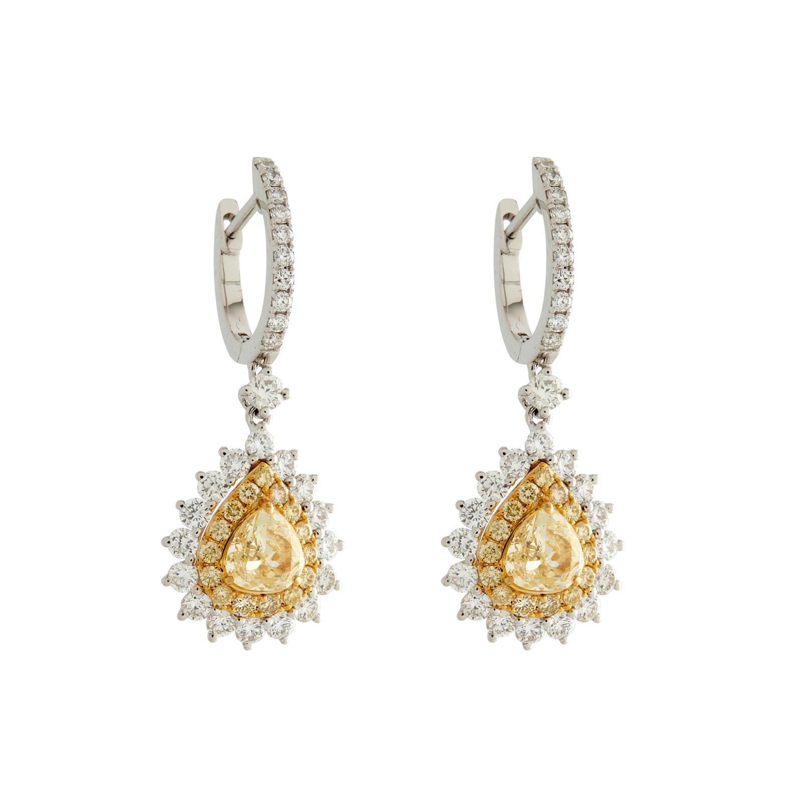 Of cluster design, each earring centring a claw-set pear-cut yellow diamond within a surround of brilliant-cut yellow diamonds and a further surround of brilliant-cut colourless diamonds, the yellow diamonds together weighing approximately 1.00 carat, the colourless diamonds together weighing approximately 1.34 carats, to post fittings, length 29mm.