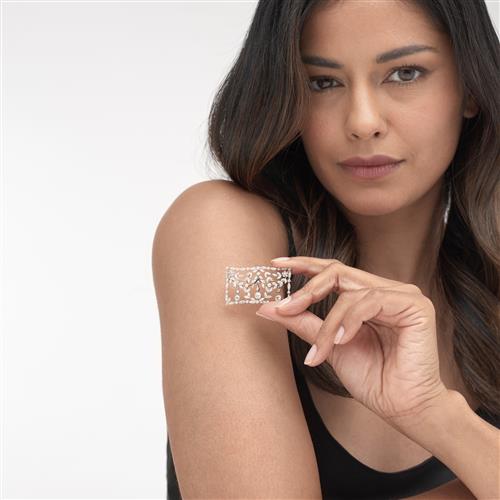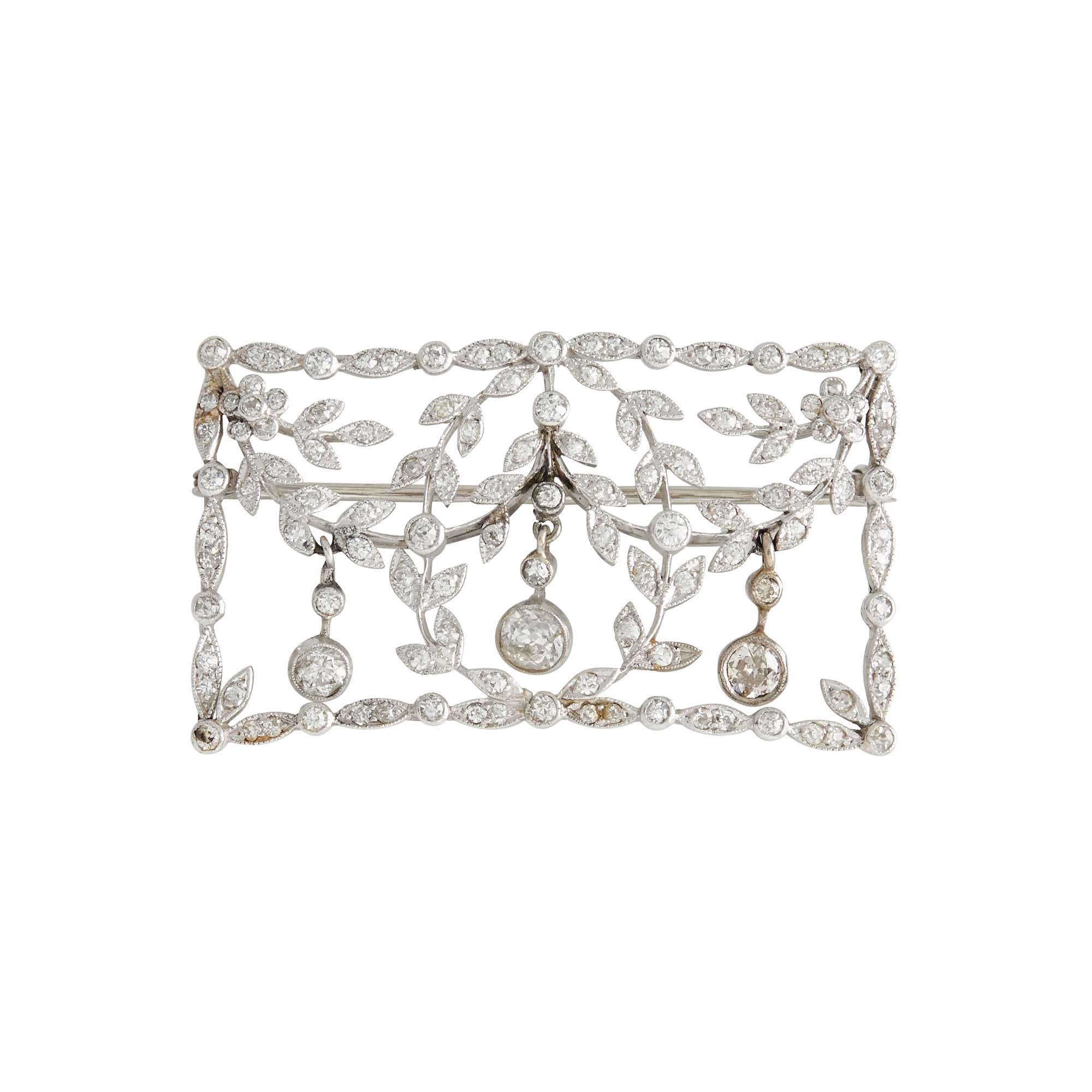 The rectangular plaque of openwork foliate design, set throughout with old European-cut diamonds, length 25mm, width 44mm, gross weight 11.1 grams.