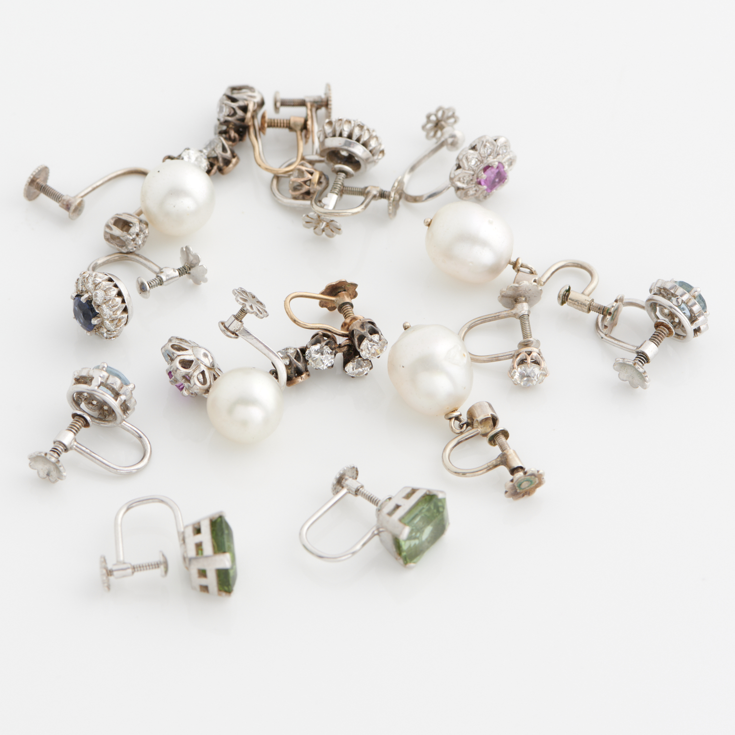 A COLLECTION OF EIGHT ASSORTED PAIRS OF GEM-SET EARRINGS IN 14CT WHITE GOLD, 9CT WHITE GOLD AND SILVER, TO SCREW BACK FITTINGS, INCLUDING TWO PAIRS OF PEARL AND DIAMOND SET, ONE PAIR OF DIAMOND AND AQUAMARINE, ONE PAIR OF SAPPHIRE AND DIAMOND, TWO PAIRS OF DIAMOND, ONE PAIR OF PINK SAPPHIRE AND DIAMOND AND ONE PAIR OF GREEN GEM-SET, TOTAL WEIGHT 31.0GMS