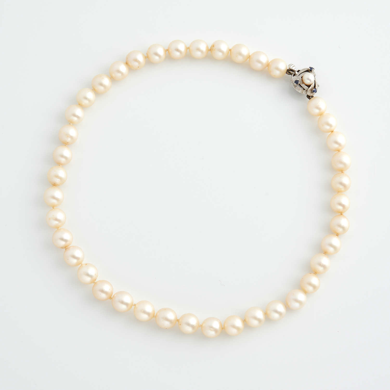 A STRAND OF CULTURED PEARLS TO A GEM SET CLASP IN 14CT WHITE GOLD, 395MM, THE PEARLS MEASURING APPROXIMATELY 8.7MM