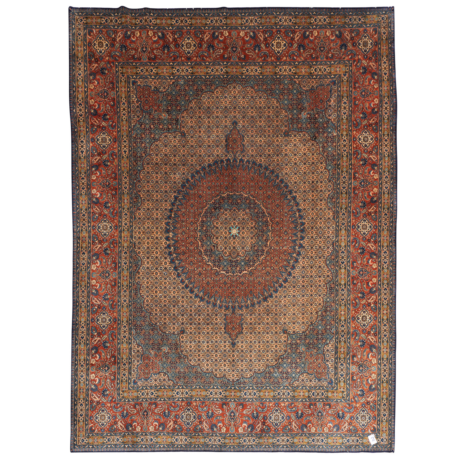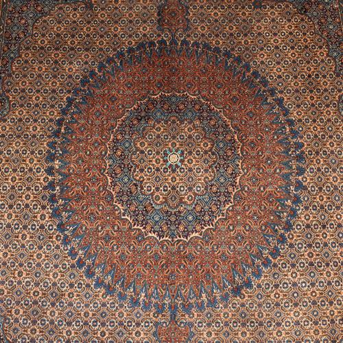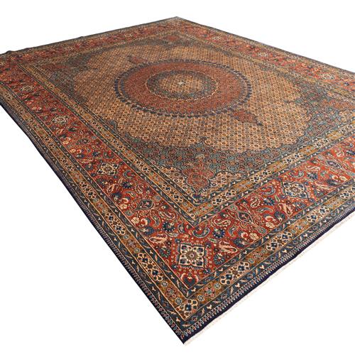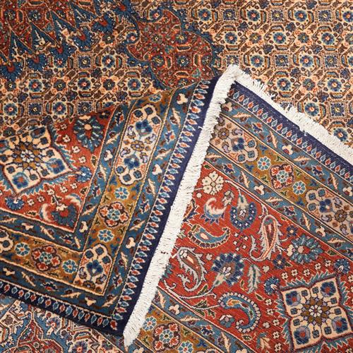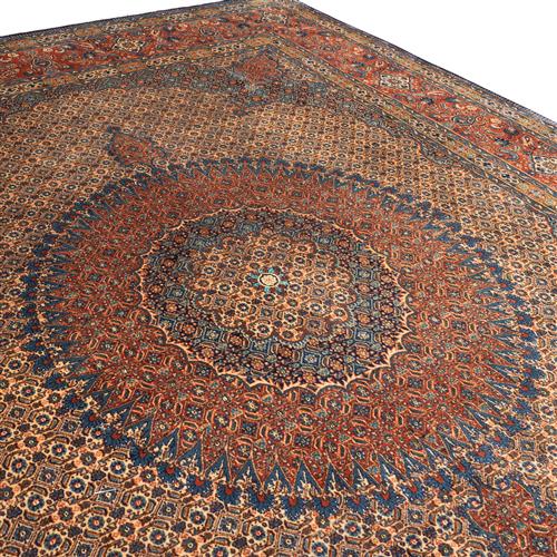 A VERY INTRICATE HAND-KNOTTED PERSIAN BIRJAND MOOD CARPET, 100% SILK AND WOOL, WITH APPROXIMATELY 400,000 KNOTS PER SQUARE METRE. SOLID; DENSE PILE. CLASSIC MOOD DESIGN OF ELONGATED SUNBURST MEDALLION; QUARTERED CORNER MEDALLIONS IN A FIELD OF FLORAL HERATI MAHI PATTERNS. BORDER OF ROSETTES AND HERATI PATTERNS. WITH TONES OF BLUE, REDS, AND CREAM WITH TURQUOISE BLUE SILK HIGHLIGHTS. SIZE: 405 X 296 CM ORIGIN: PERSIA – RRP: $8,500 DOCUMENTATION OF AUTHENTICITY INCLUDED.