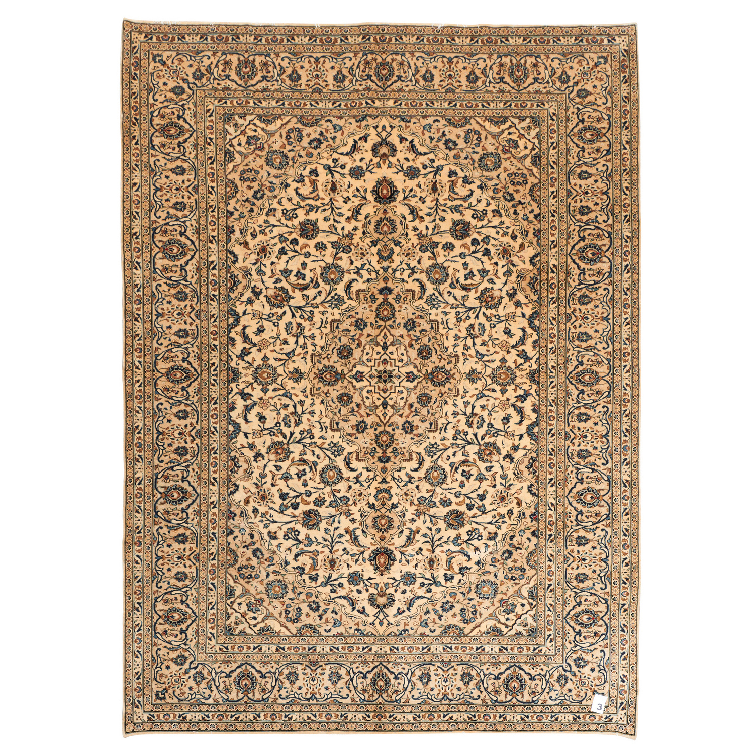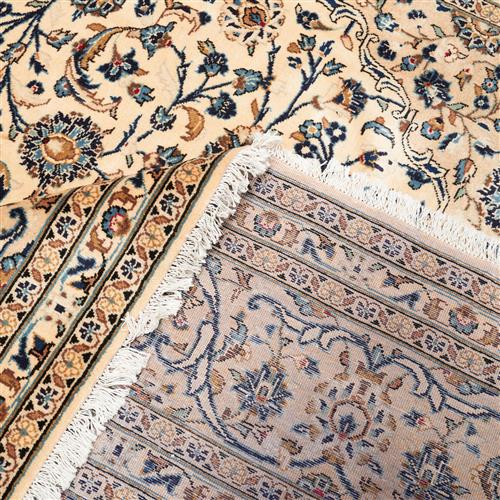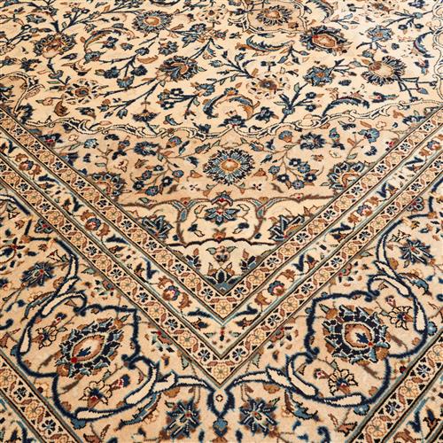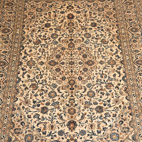A PERSIAN CREAM KASHAN CARPET. WITH 100% WOOL PILE, VERY SOLID AND DENSELY HAND KNOTTED. IN A TRADITIONAL DESIGN OF A CENTRAL MEDALLION IN SOFT TONES OF BLUES, VANILLA, AND TAUPE. WITH ALL OVER SHA ABBASI PALMETTES, TENDRILS. SIZE: 413 X 300 CM ORIGIN: PERSIA – RRP: $5,900 DOCUMENTATION OF AUTHENTICITY INCLUDED.