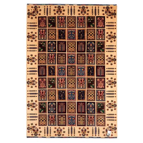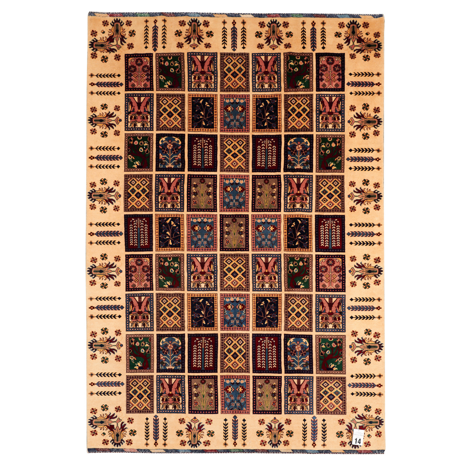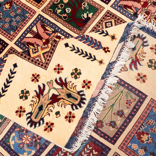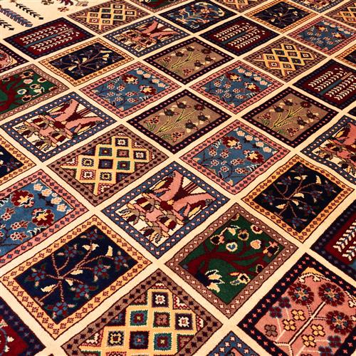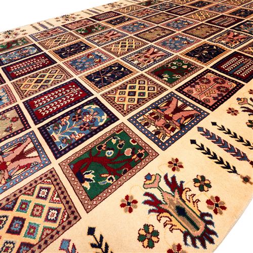 A ONE OF A KIND "GARDEN DESIGN" PERSIAN SIRJAN, 100% SOLID AND DENSE WOOL, ORGANIC DYES. ALL OVER PANEL DESIGN OF WILLOW TREES, GEOMETRIC MOTIFS, FLORAL SHRUBS. UNIQUE BORDER OF TREE OF LIFE AND IRIS MOTIFS ON AN IVORY FIELD. SIZE: 300 X 205 CM -ORIGIN: PERSIA – RRP: $6,200 DOCUMENTATION OF AUTHENTICITY INCLUDED.