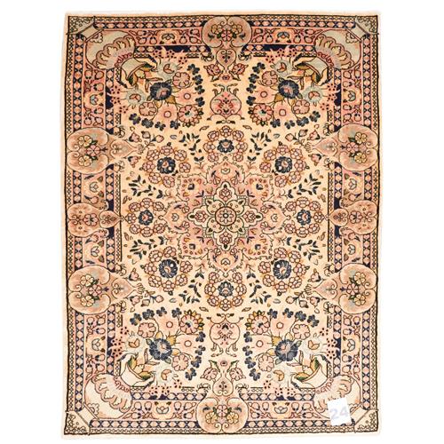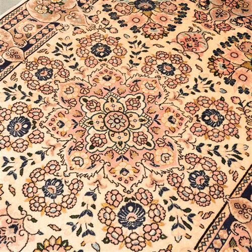 A FINE PERSIAN BIDJAR, 100% DENSELY WOVEN WOOL, HAND KNOTTED, SHEEN TO THE WOOL. CENTRAL FLORAL MEDALLION WITH VASES BEARING FLOWERS ON A CREAM FIELD. SHEEN TO THE WOOL PILE. SIZE: 155 X 116 CM ORIGIN: PERSIA – RRP: $2,100 DOCUMENTATION OF AUTHENTICITY INCLUDED.