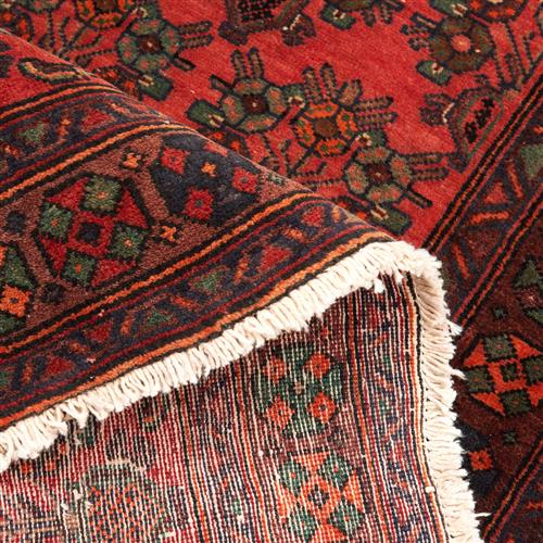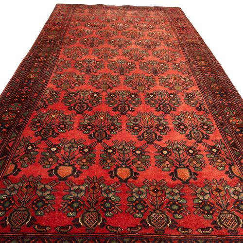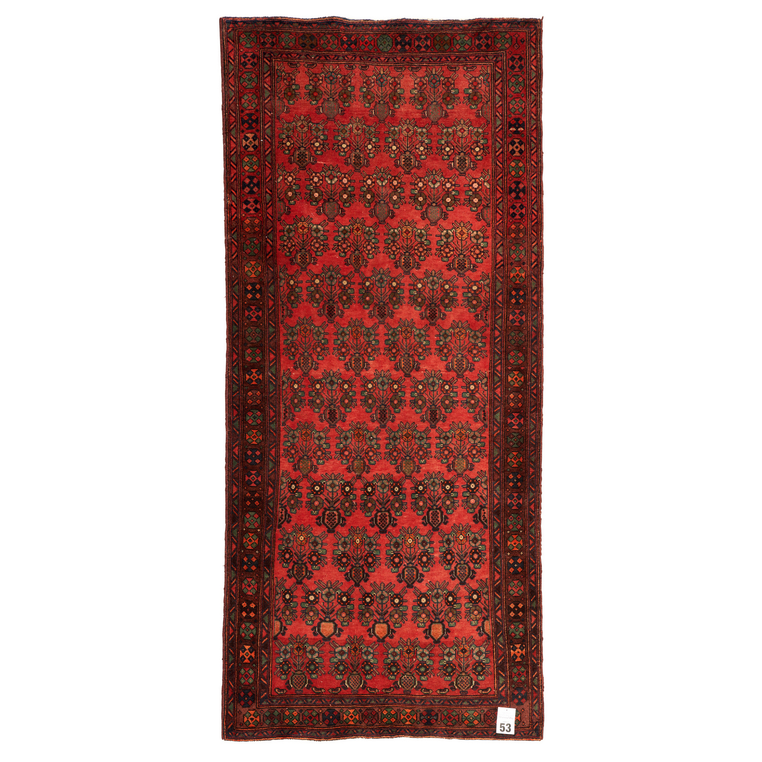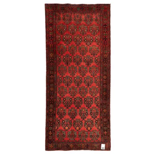 A SOLID PERSIAN GHOLTOGH RUNNER, 100% HAND SPUN WOOL, HAND-KNOTTED. ALL OVER DESIGN OF URNS BEARING FLOWERS A SOFT RED FIELD. BORDER OF MINIATURE ROSETTES AND TRIBAL MOTIFS. SIZE: 285 X 126 CM- ORIGIN: IRAN – RRP: $1,700 DOCUMENTATION OF AUTHENTICITY INCLUDED.