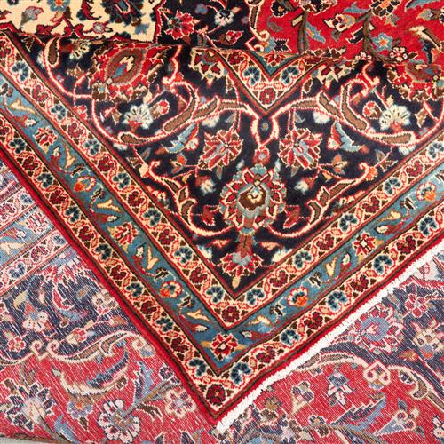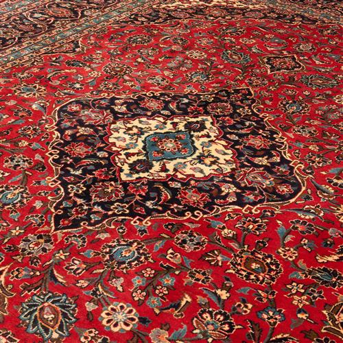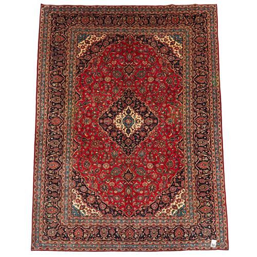 A CIRCA 1980'S CLASSIC PERSIAN KASHAN ARDAKAN CARPET, 100% HAND KNOTTED WOOL, SEMI VINTAGE PILE. CLASSIC KASHAN BOOK-COVER DESIGN OF ELONGATED FLORAL MEDALLION; CORNER MEDALLIONS IN A PERSIAN BLUE, CREAM AND FRENCH BLUE, IN A FIELD OF SHAH ABBASI PALMETTES, FLORAL MOTIFS; TENDRILS. BORDER IN PERSIAN BLUE OF PALMETTES. CLEAN AND DUST FREE. RRP: $2,600- SIZE: 414 X 295 CM ORIGIN: IRAN DOCUMENTATION OF AUTHENTICITY INCLUDED.