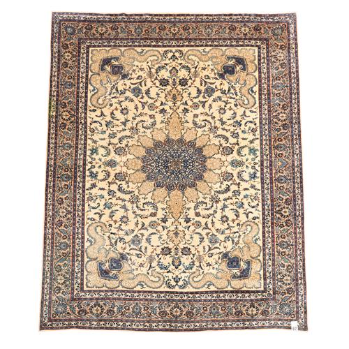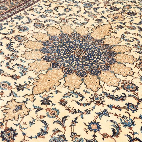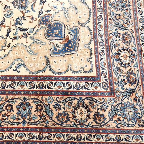 A FINE PERSIAN KASHMAR CARPET, FINELY AND VERY DENSELY HAND KNOTTED. THE CARPET HAS A VIBRANT SUNBURST CENTRAL MEDALLION IN FRENCH BLUE AND PLATINUM ON AN IVORY FIELD WITH ALL OVER SHA ABASI PALMETTES AND TENDRILS. UNIQUE CLOUD COLLAR CORNER MEDALLION MOTIFS. SUPERB POLISH TO THE WOOL. SIZE: 400 X 305 CM – RRP: $5,900 - ORIGIN: IRAN DOCUMENTATION OF AUTHENTICITY INCLUDED.