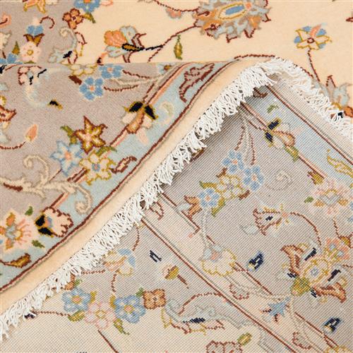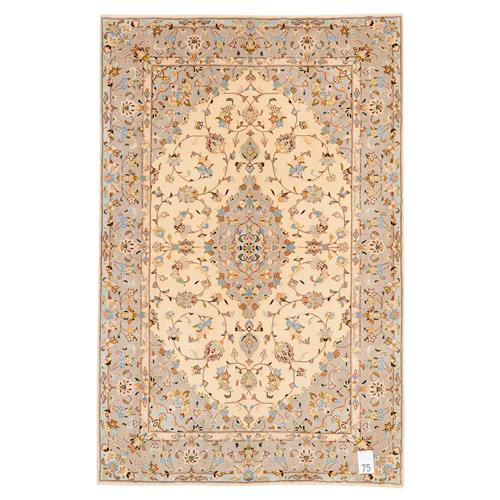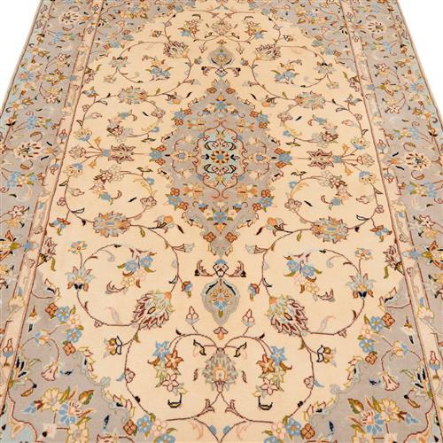 A FINE PERSIAN CREAM KASHAN CARPET. WITH 100% LAMBS WOOL PILE, VERY SOLID AND DENSELY HAND KNOTTED. IN A TRADITIONAL DESIGN OF A BEAUTIFUL CENTRAL MEDALLION IN SOFT TONES OF LIGHT GREY; LIGHT BLUE WITH HIGHLIGHTS OF GREEN AND PEACH. ALL OVER DESIGN OF SHA ABBASI PALMETTES AND FLORAL SPRAYS. CONDITION IS SUPERB. SIZE: 222 X 145 CM ORIGIN: PERSIA – RRP: $2,900 DOCUMENTATION OF AUTHENTICITY INCLUDED.