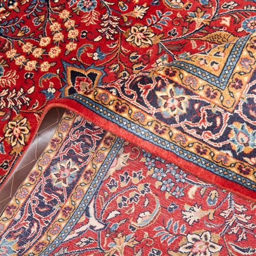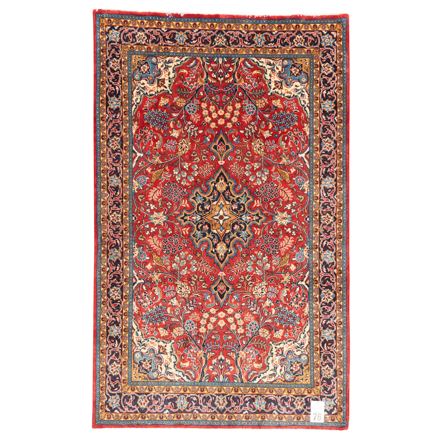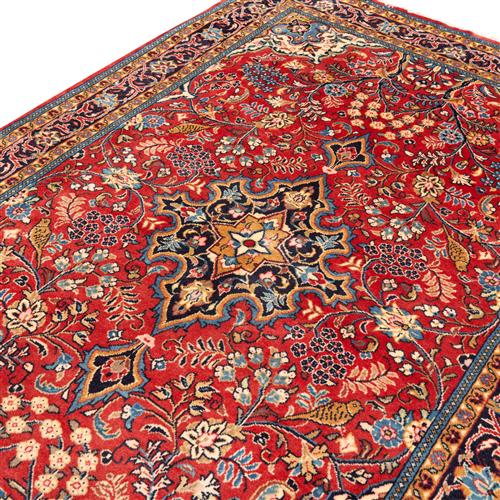 A PERSIAN SAROUQ RUG, 100% SOLID WOOL- DENSE PILE. HAND- KNOTTED CITY WEAVE WITH CLASSIC PERSIAN FLORAL DESIGN OF A CENTRAL FLORAL MEDALLION ON A RED FIELD OF BRANCHES WITH FLORAL SPRAYS, BIRD OF PARADISE AND TREE OF LIFE. BORDER OF ROSETTES. BORDER OF PALMETTES AND ESLIMI SCROLLS. SIZE: 215 X 137 CM ORIGIN: IRAN - – RRP: $2,900 DOCUMENTATION OF AUTHENTICITY INCLUDED.