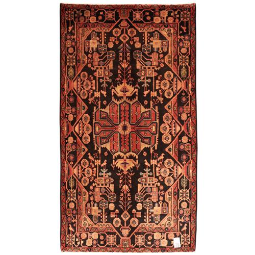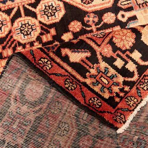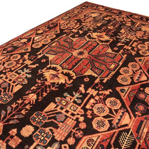 A PERSIAN TRIBAL NAHAVAND RUG. 100% WOOL. NATURAL DYES. HAND-KNOTTED WEAVE WITH A DESIGN OF CENTRAL TRIBAL MEDALLION SET WITHIN A CHARCOAL FIELD OF ROSETTES, BIRD, AND TREE OF LIFE MOTIFS. BORDER OF ROSETTES AND GEOMETRIC MOTIFS. SIZE: 285 X 157 CM ORIGIN: PERSIA – RRP: $1,800 DOCUMENTATION OF AUTHENTICITY INCLUDED.