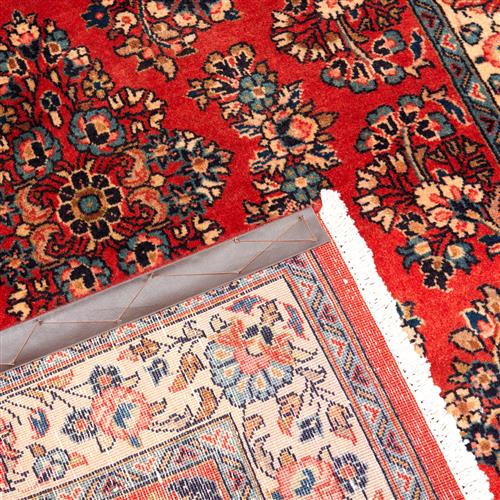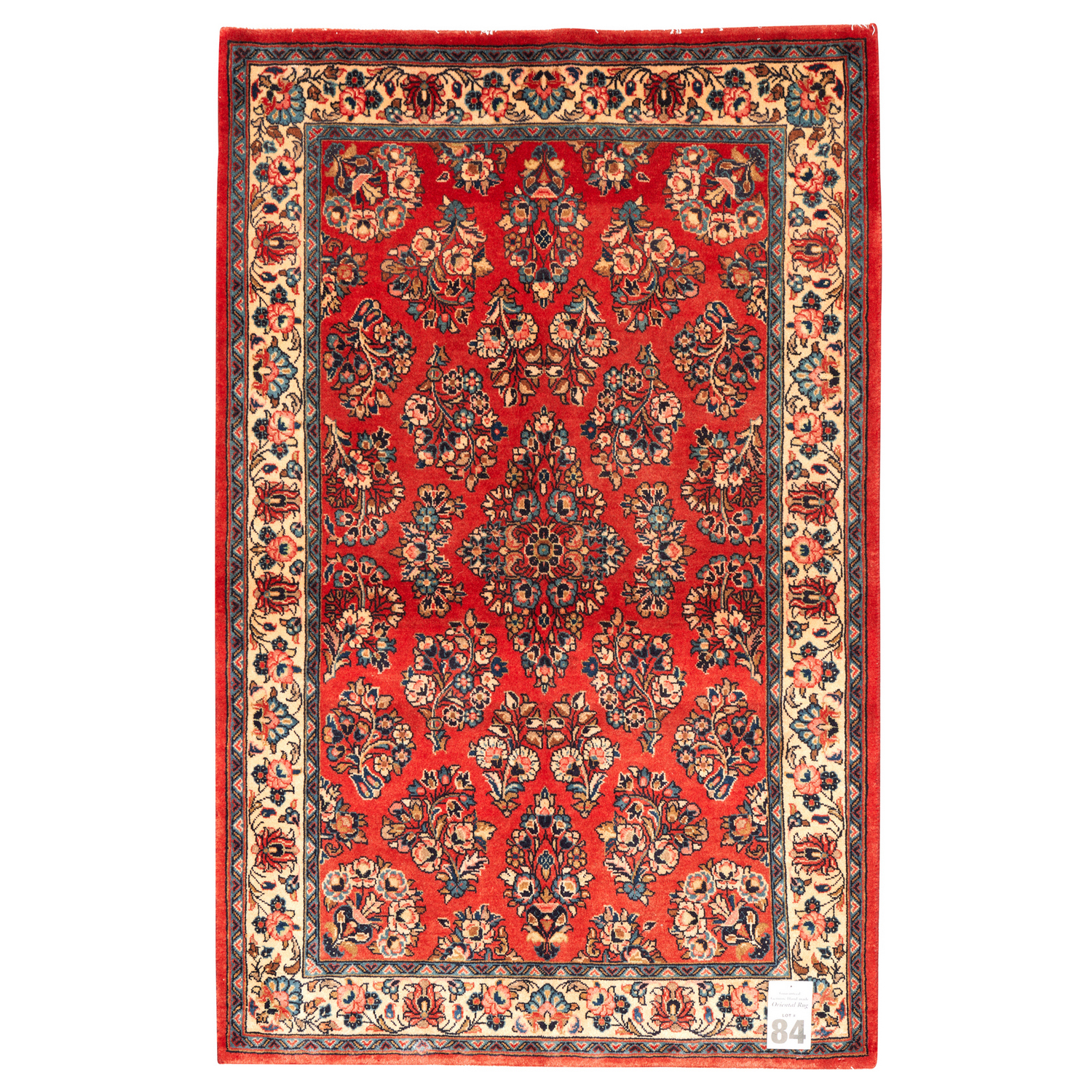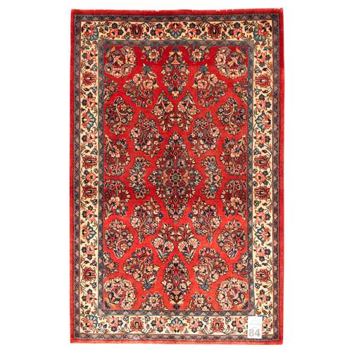 A PERSIAN SAROUQ RUG, 100% SOLID LAMBS WOOL PILE. HAND- KNOTTED VILLAGE WEAVE WITH CLASSIC DESIGN OF SMALL DIAMOND MEDALLION ON AN ALL-OVER RED FIELD OF FLORAL SPRAYS. FLORAL BORDER OF ROSETTES. SIZE: 162 X 108 CM ORIGIN: PERSIA – RRP: $1,400 DOCUMENTATION OF AUTHENTICITY INCLUDED.