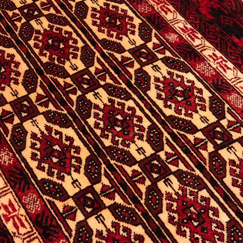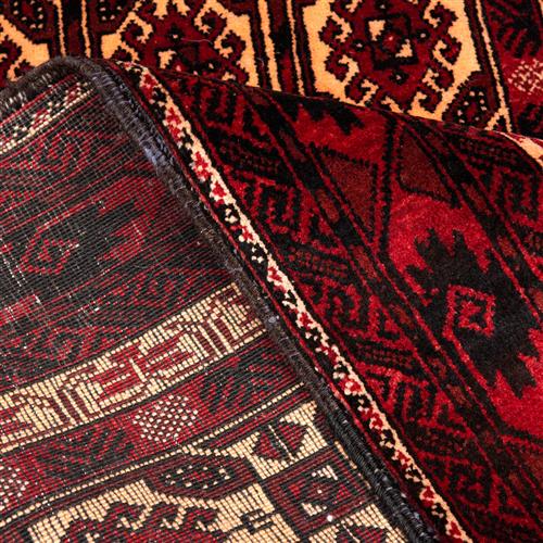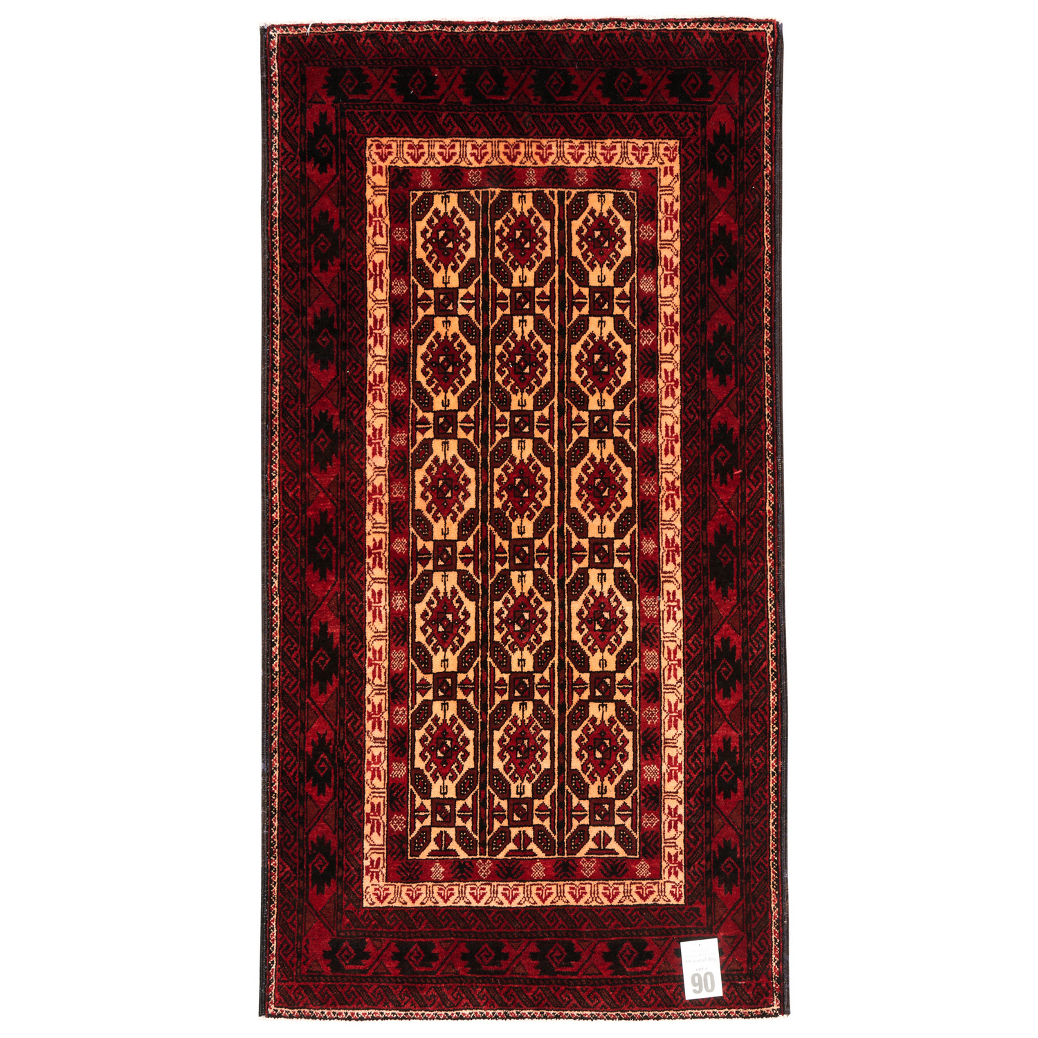 A PERSIAN TURKOMAN TORBAT BALOUCH RUG, 100% SOLID AND DENSE WOOL, NATURAL DYES. HAND-KNOTTED TRIBAL WEAVE WITH TRADITIONAL DESIGN OF ALL OVER CASEMENT DESIGN FILLED WITH TRIBAL AND GEOMETRIC DESIGNS. SIZE: 200 X 1OO CM ORIGIN: PERSIA – RRP: $1,100 DOCUMENTATION OF AUTHENTICITY INCLUDED.