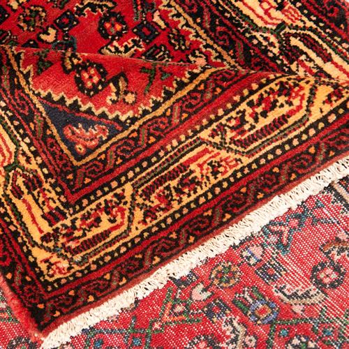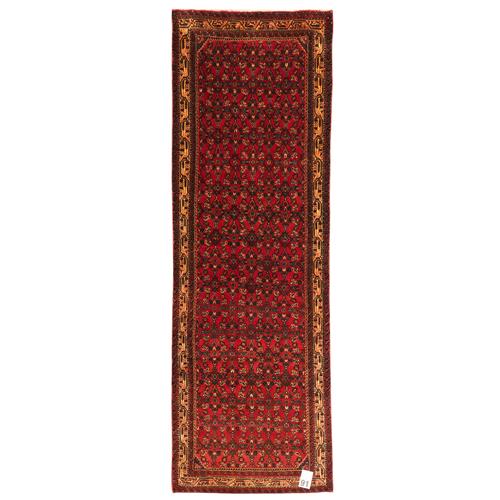 A FINE PERSIAN ENJELAS HALL RUNNER, 100% HAND SPUN WOOL. HAND-KNOTTED VILLAGE WEAVE FROM THE HAMADAN REGION WITH TRIBAL DESIGN OF ALL OVER HERATI MOTIFS ON A SOFT RED FIELD. SERABAND DESIGN BORDER SIZE: 296 X 100 CM ORIGIN: PERSIA – RRP: $1,300 DOCUMENTATION OF AUTHENTICITY INCLUDED