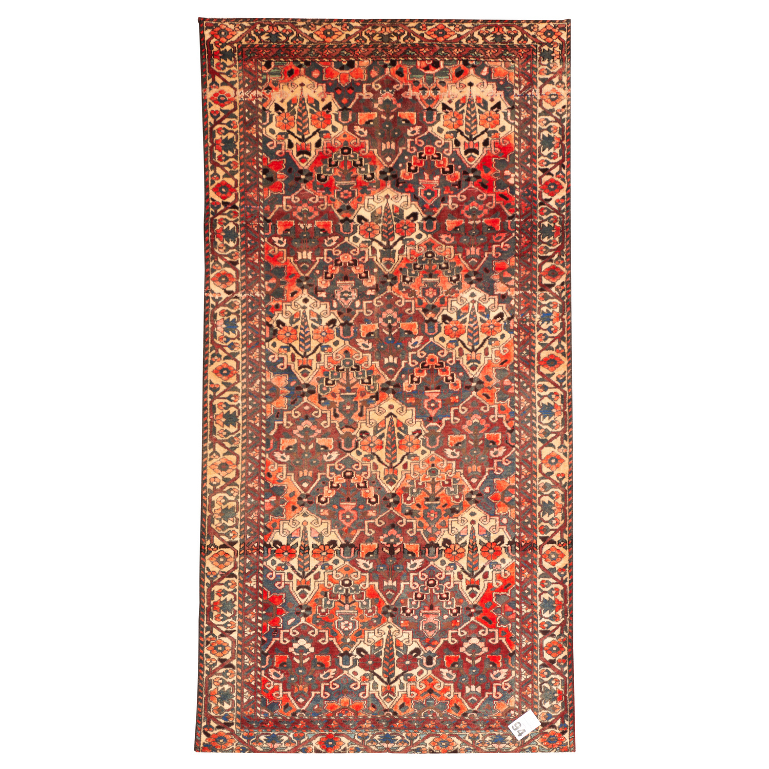 A CIRCA 1970'S TRIBAL PERSIAN BAKHTIAR RUG. 100% WOOL, NATURAL DYES. VINTAGE PILE. HAND-KNOTTED TRIBAL BAKHTIARI WEAVE WITH TRADITIONAL "GARDEN" DESIGN CONTAINING GARDEN THEMES OF WILLOW TREES, FLORAL SHRUBS AND URNS WITH FLOWERS. BORDER OF TRIBAL PALMETTES; ROSETTES. SOFT MELLOW TONES. SIZE: 290 X 144 CM ORIGIN: PERSIA – RRP: $1,1000 DOCUMENTATION OF AUTHENTICITY INCLUDED.